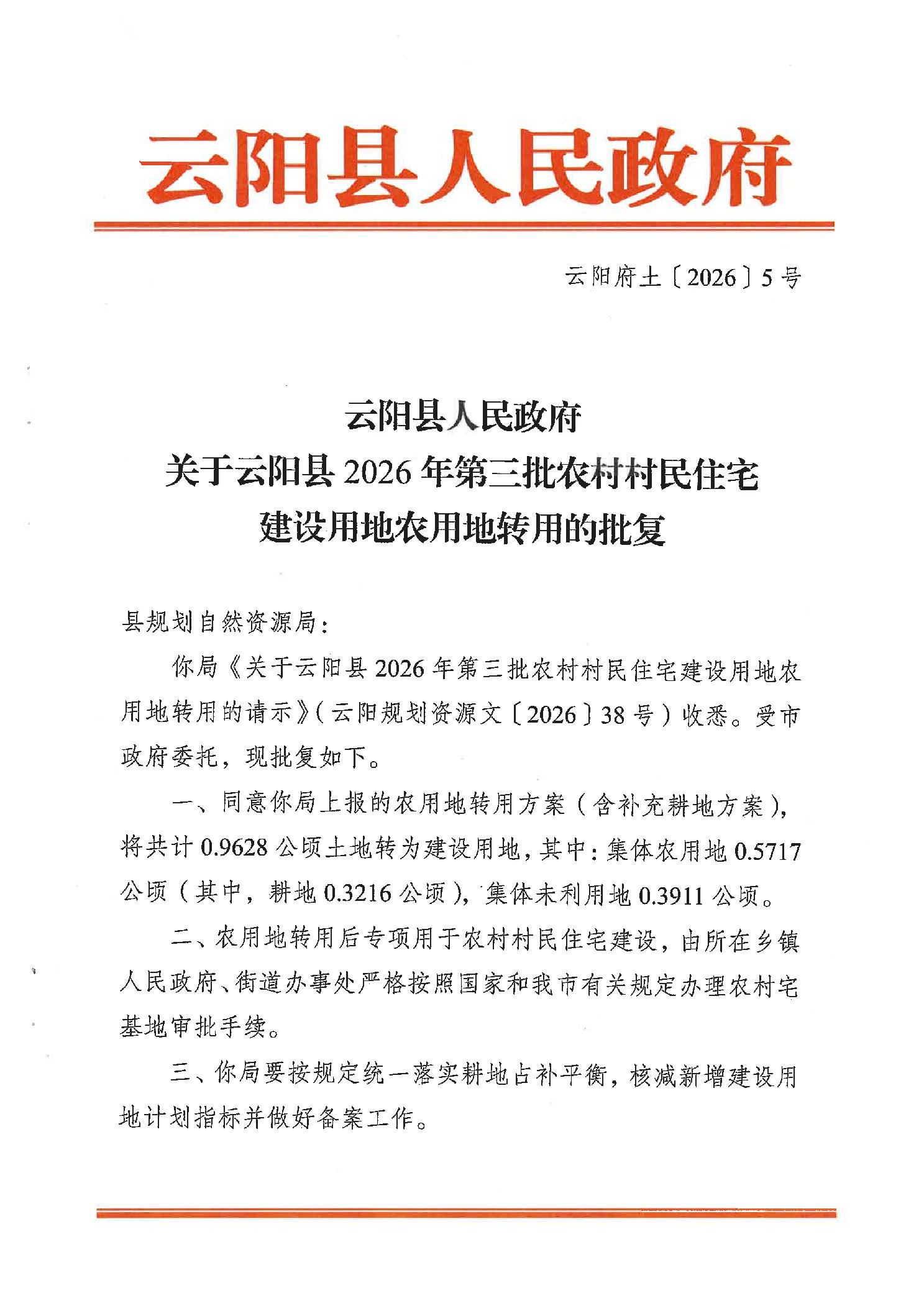 云阳府土〔2026〕5号关于云阳县2026年第三批农村村民住宅建设用地农用地转用的批复