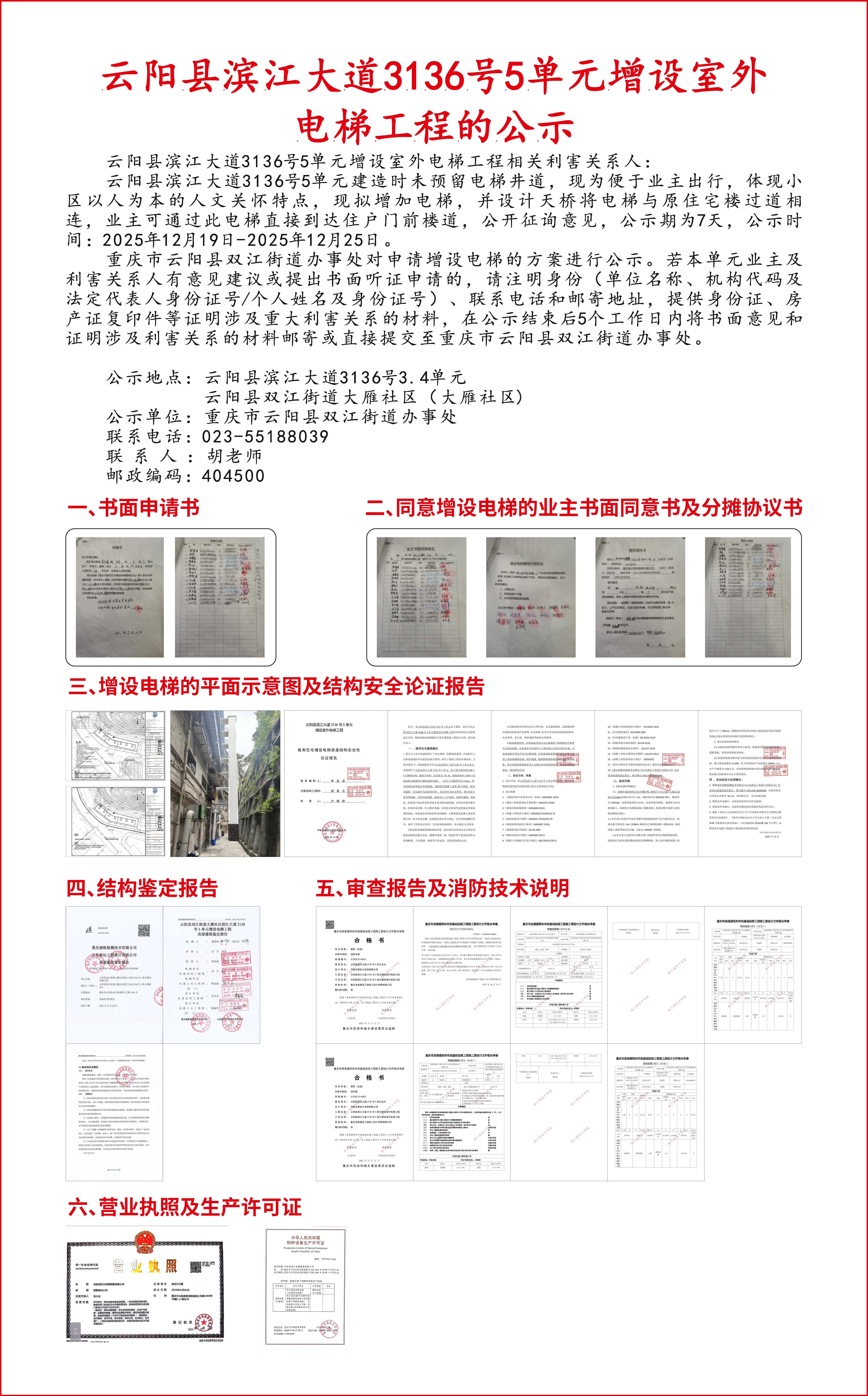 云阳县滨江大道3136号5单元增设室外电梯工程的公示