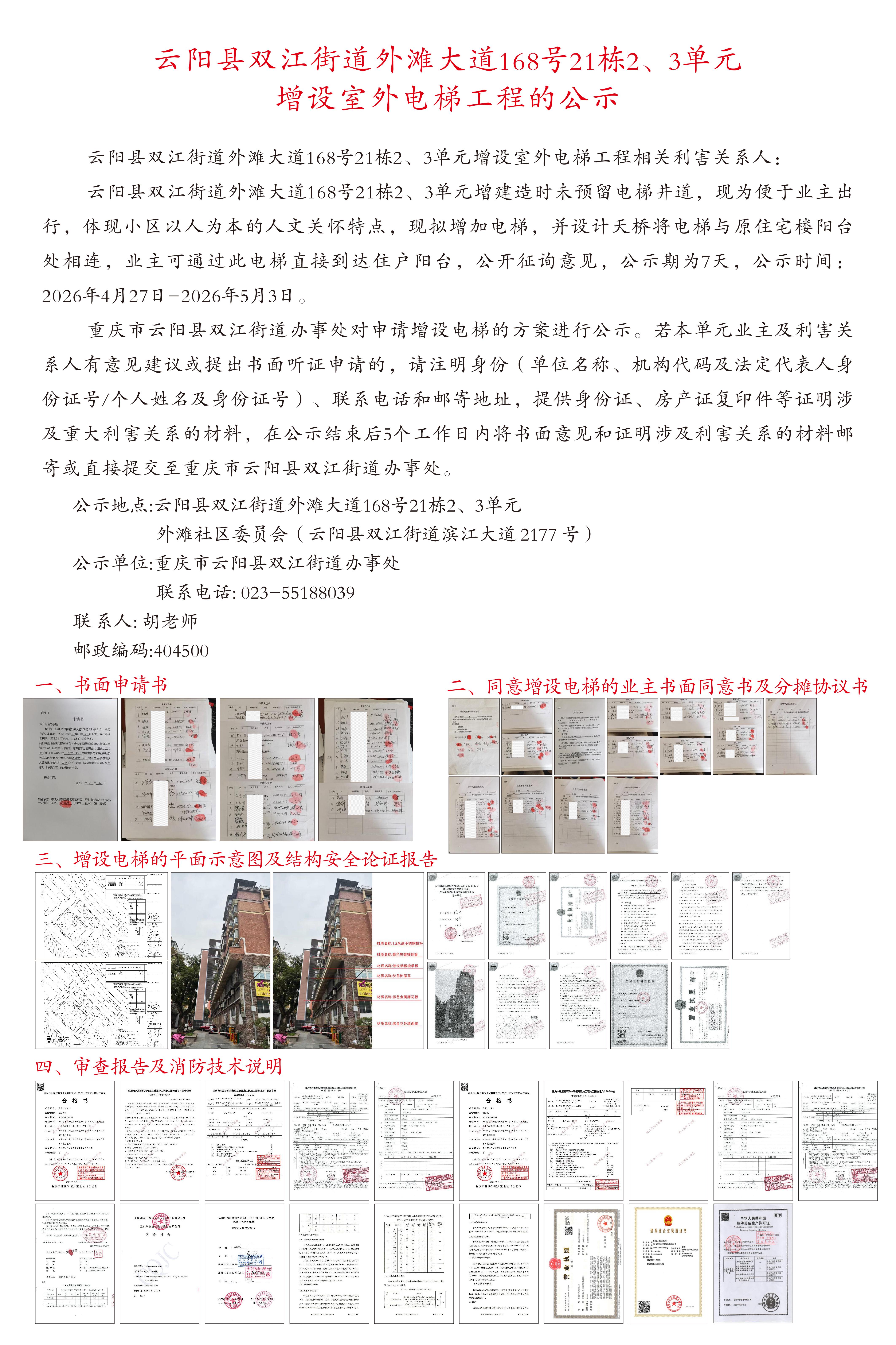 云阳县双江街道外滩大道168号21栋2、3单元增设室外电梯工程的公示
