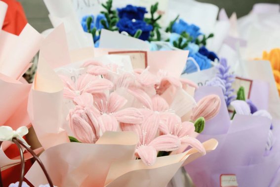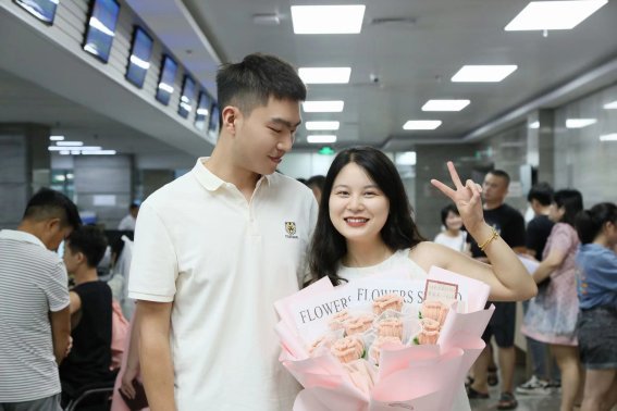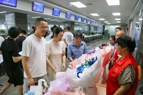 在领证现场,一束束手工制作的绒花格外显眼,有热烈的玫瑰、温婉的百合、娇羞的郁金香……记者了解到,这是由康复机构为精神障碍患者组织开展的“相约七夕·助残有你”公益售卖活动,售卖的花束均是由康复机构的精神障碍患者制作而成。为此,不少新人也选择献出自己的一份爱心,将幸福传递。