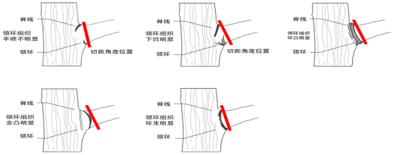 4.3.3 疏大枝时应保证剪口下不留残桩,应在分枝的结合部隆起部分(领环组织)的外侧剪切,不应伤及皮脊线与领环组织,剪口要平滑,利于愈合。不同型“领环组织”切锯角度位置如图1所示。