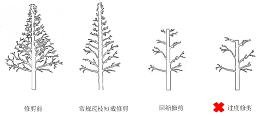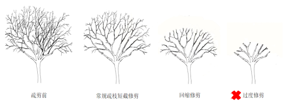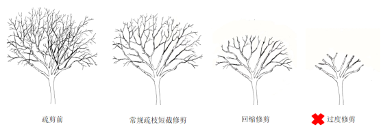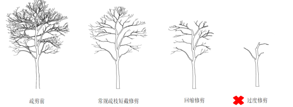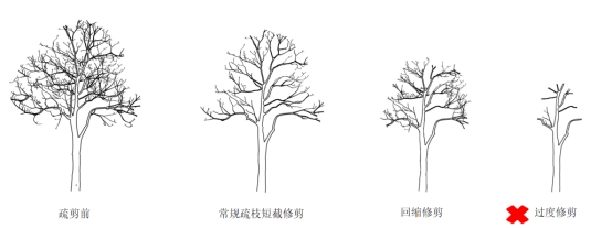 根据树木种类和修剪目的,采取因树因地的分类修剪方法。