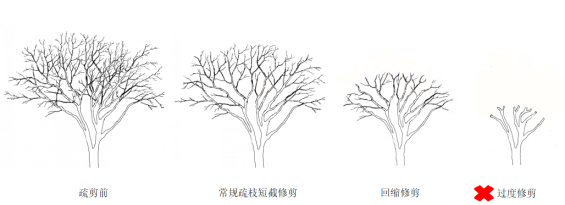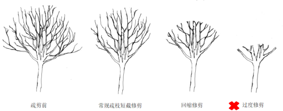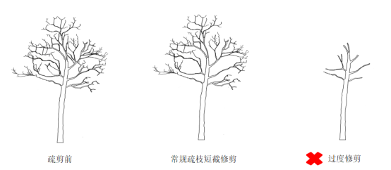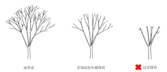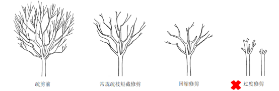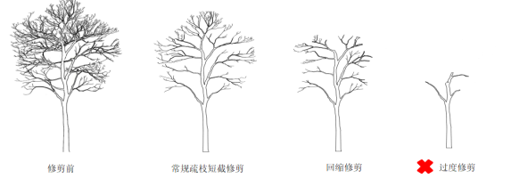 4.2.1 落叶树的回缩修剪应在树木全部落叶后至翌年萌芽前进行,避开极端低温天气。