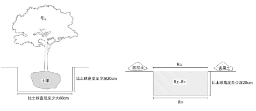 (1)种植穴宜上下大小一致,大小、形状、深浅应根据植物根系和土球大小而定,宽度较根系或土球的直径至少应加大60cm,深度至少应加深20cm(如图6所示)。