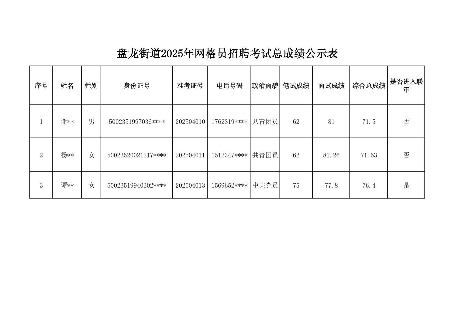 盘龙街道2025年网格员招聘考试总成绩公示表