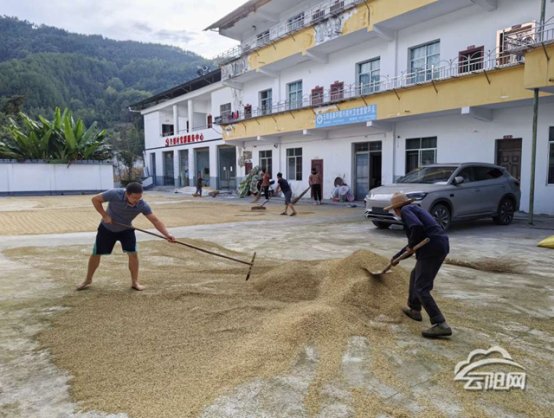 就在这紧急关头,村干部和驻村工作队看到这一幕,没有丝毫犹豫,径直走上前去帮忙。他们迅速分工,有的拿起扫帚将散开的稻谷往一起归拢,有的找来更多空袋子,加快装粮的速度,还有的抱起装了一半的粮袋快步往屋檐下送。就在大家刚把最后一袋稻谷搬到室内时,大雨便哗哗地下了起来。