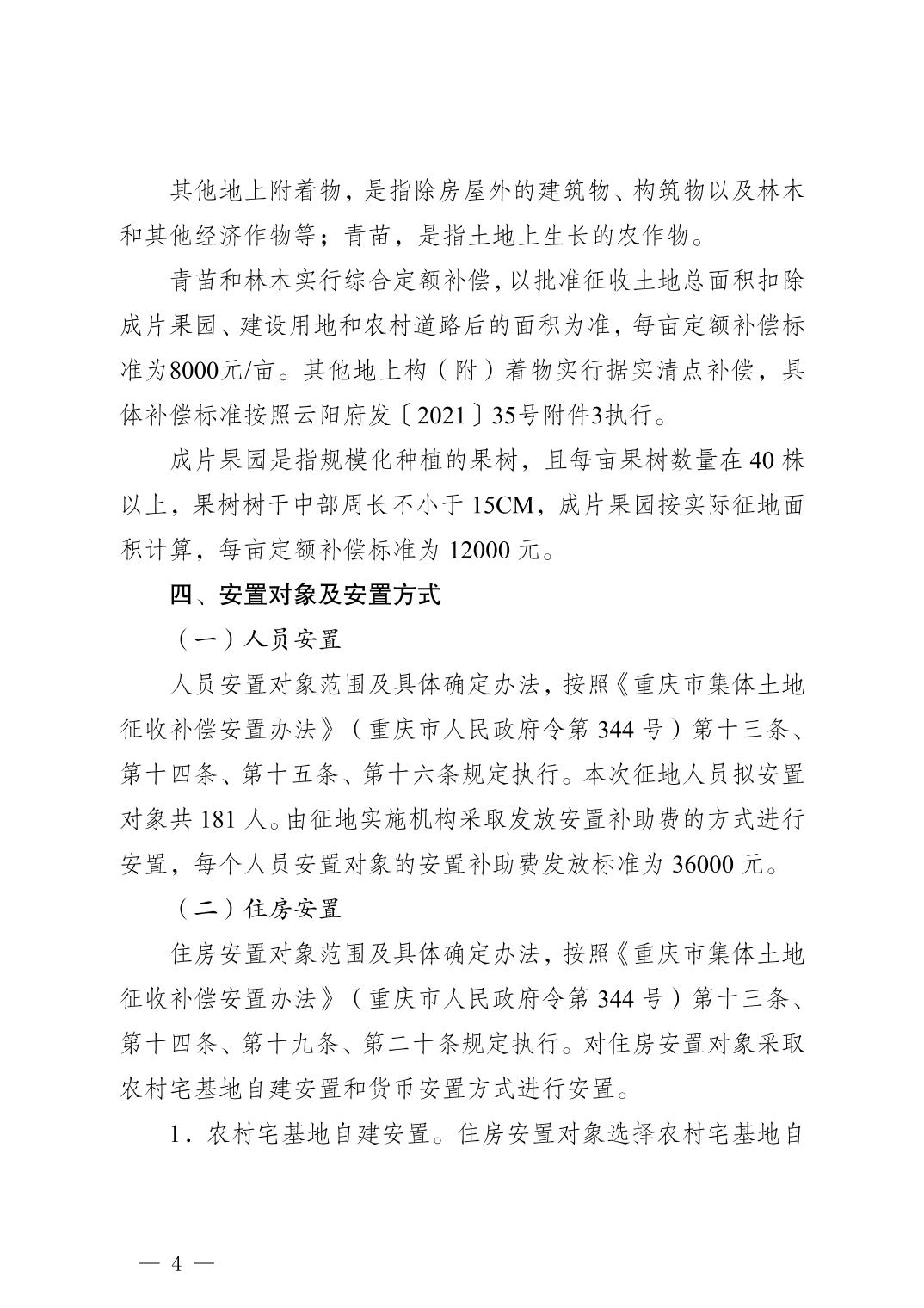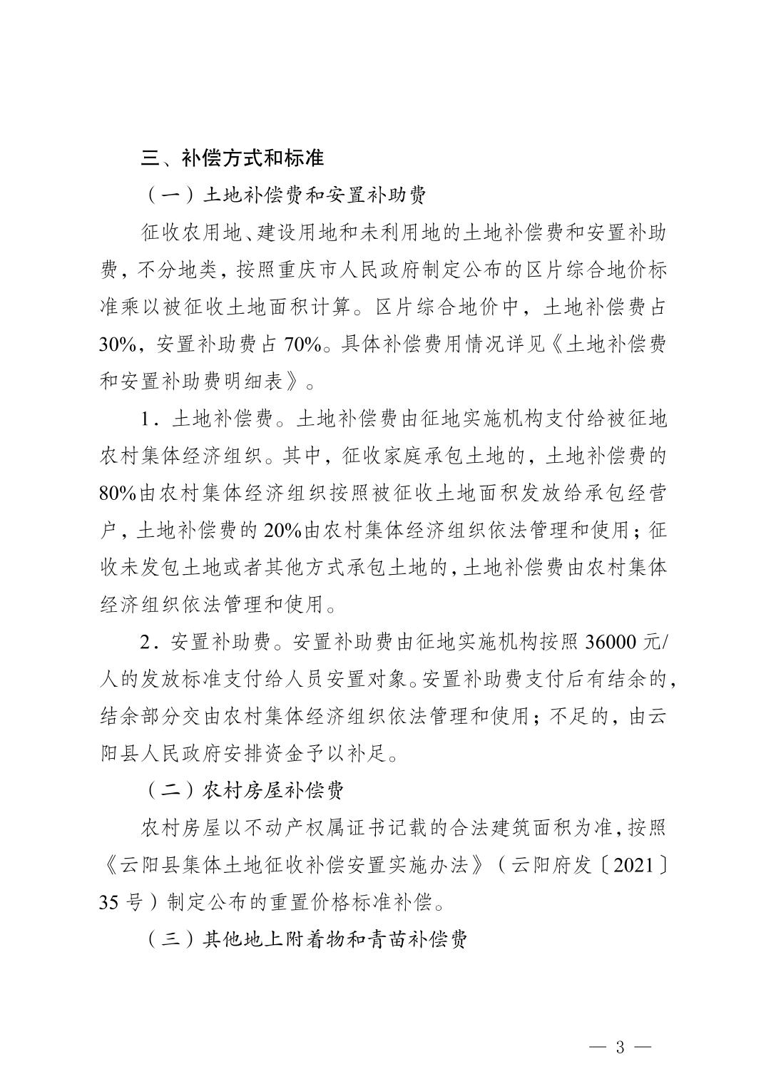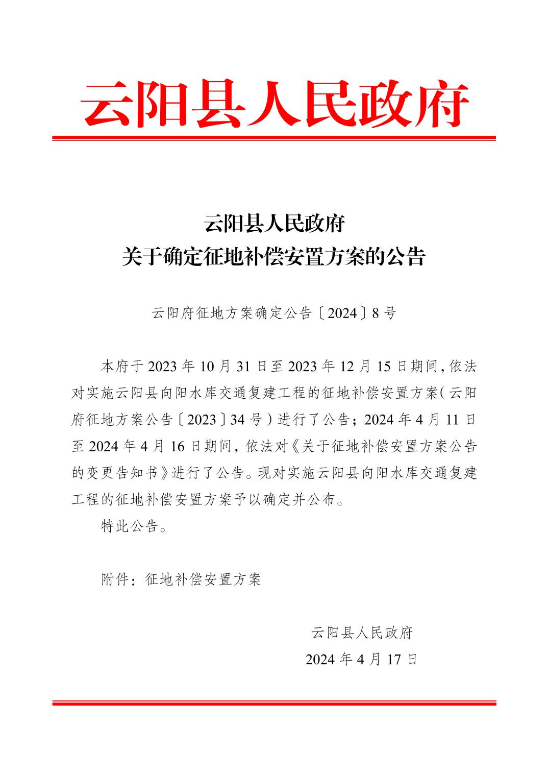 云阳县人民政府关于确定征地补偿安置方案的公告(云阳府征地方案确定公告〔2024〕 8号)