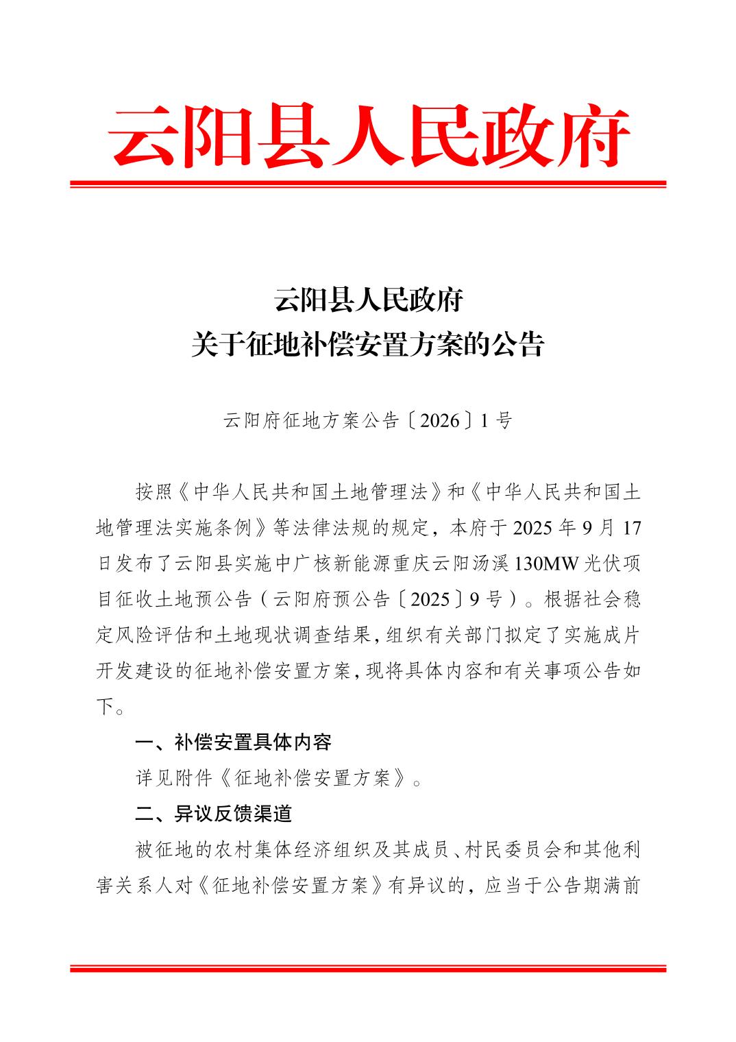 云阳县人民政府关于征地补偿安置方案的公告(云阳府征地方案公告〔2026〕1号)