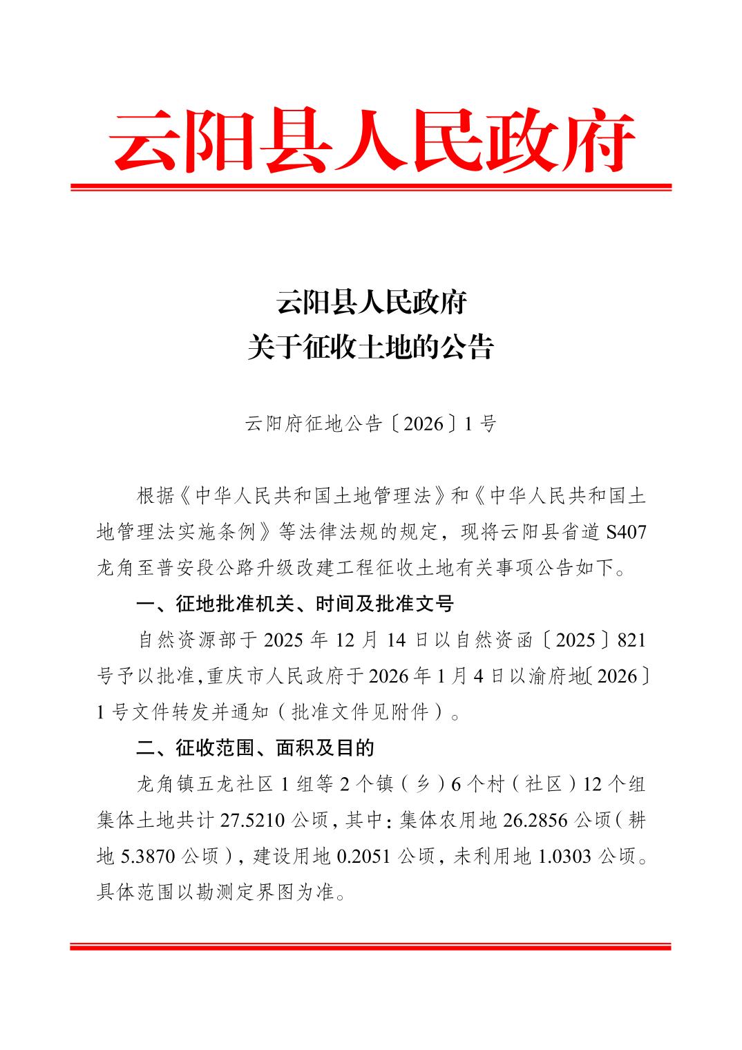 云阳县人民政府关于征收土地的公告( 云阳府征地公告〔2026〕 1号)