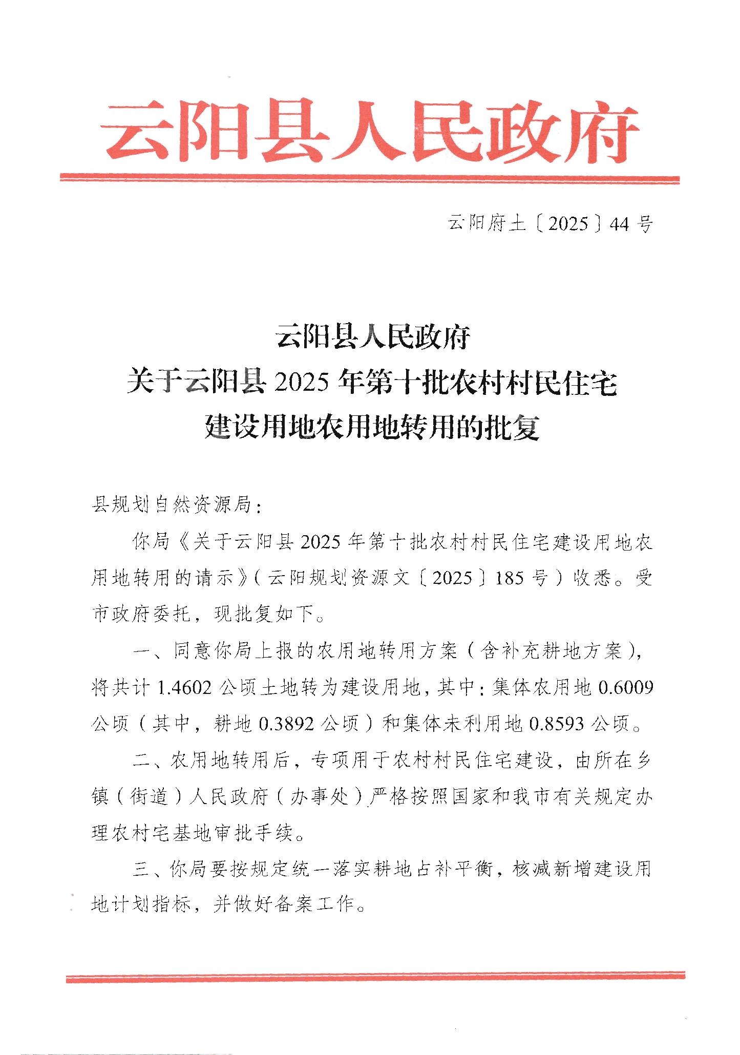 云阳府土〔2025〕44号关于云阳县2025年第十批农村村民住宅建设用地农用地转用的批复