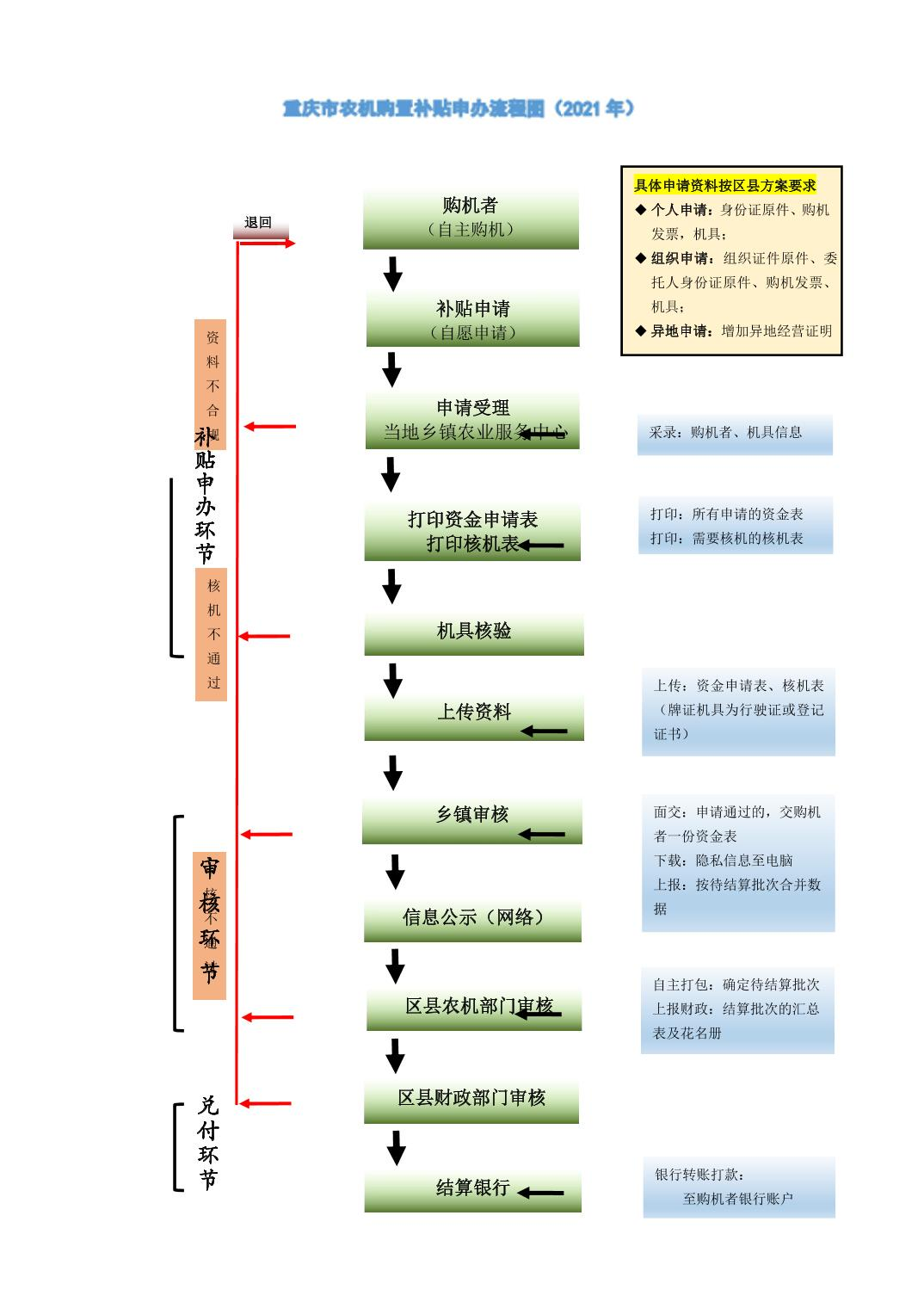 云阳县补贴机具种类主要有耕整地机械、种植施肥机械、田间管理机械、收获机械、收获后处理机械、农产品初加工机械、排灌机械、畜牧机械、水产机械、农业废弃物利用处理设备、农田基本建设机械、动力机械、设施农业设备等14个大类37个小类118个品目。具体申报流程如下图,补贴种类范围见附件:重庆市2021-2023年农机购置补贴机具补贴额一览表。
