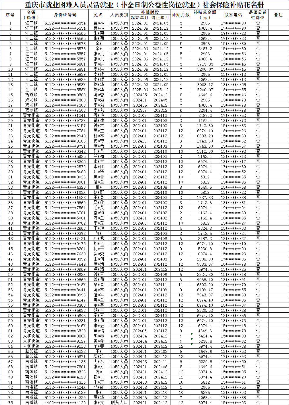 云阳县2025年第二批灵活就业社保补贴(非全日制公益性岗位)汇总表名单公示