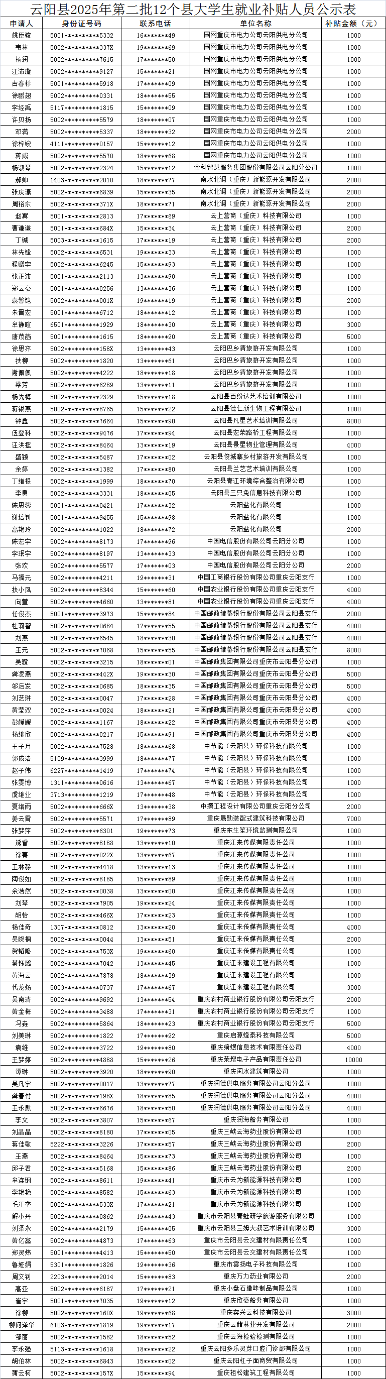 云阳县2025年第二批享受12个县大学生就业补贴名单公示