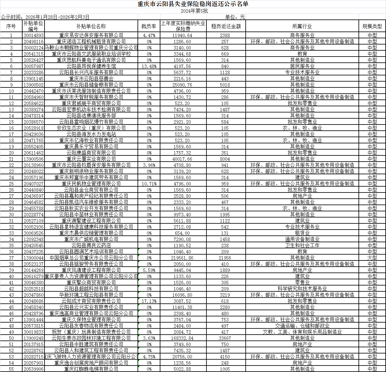 根据市人力社保局、市财政局、市税务局《关于实施失业保险稳岗惠民政策措施的通知》(渝人社规〔2025〕10号)精神,现将云阳县2024年度第五批失业保险稳岗返还名单公示如下,广泛征求群众意见。公示期为5个工作日(2026年1月28日—2026年2月3日)。