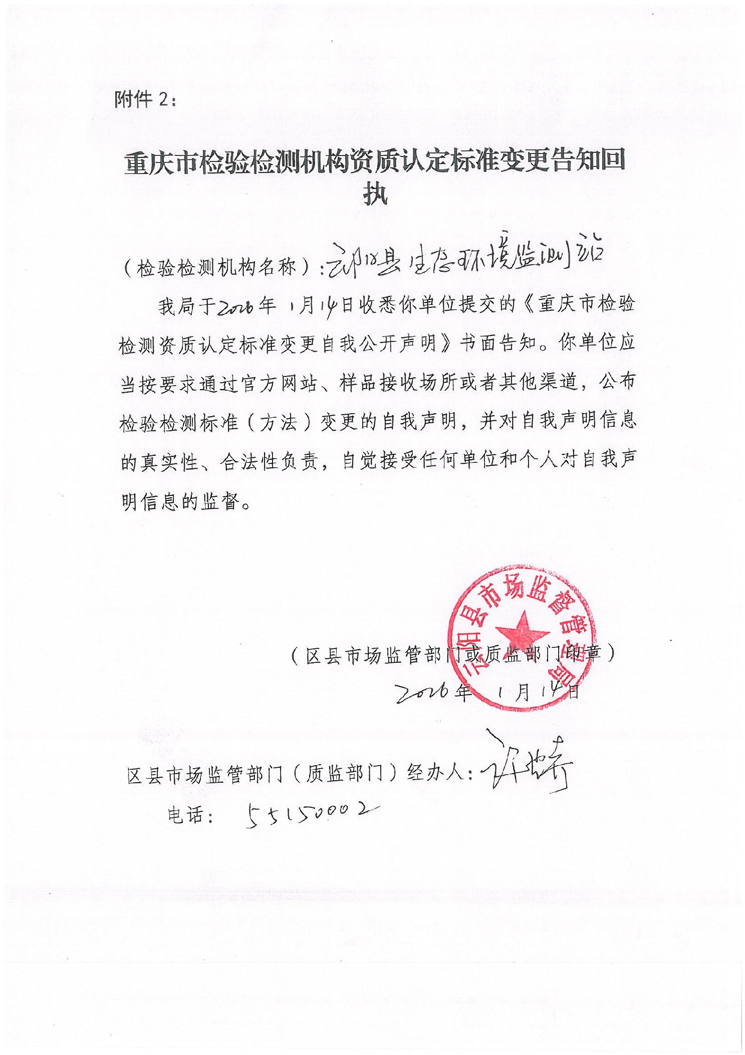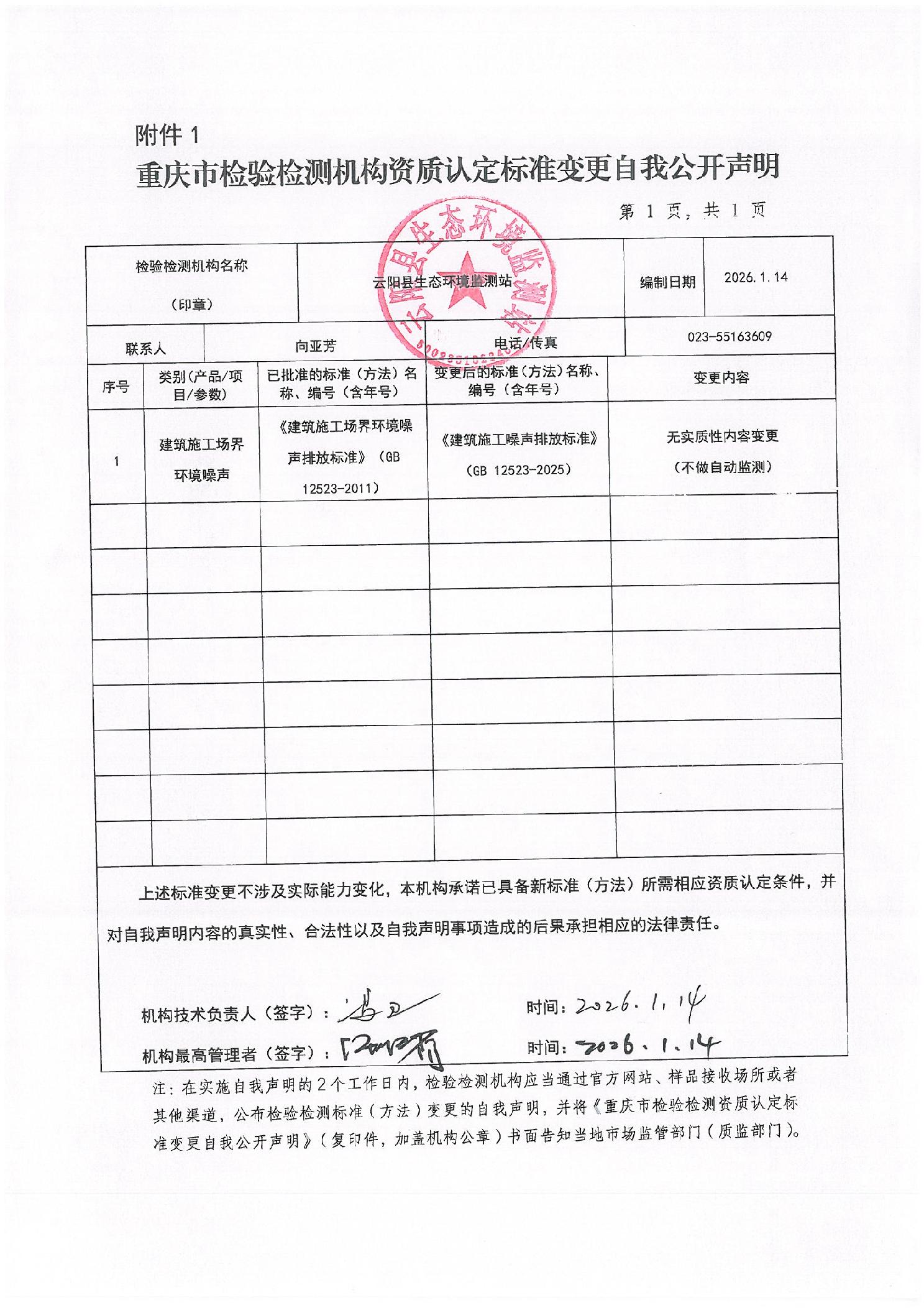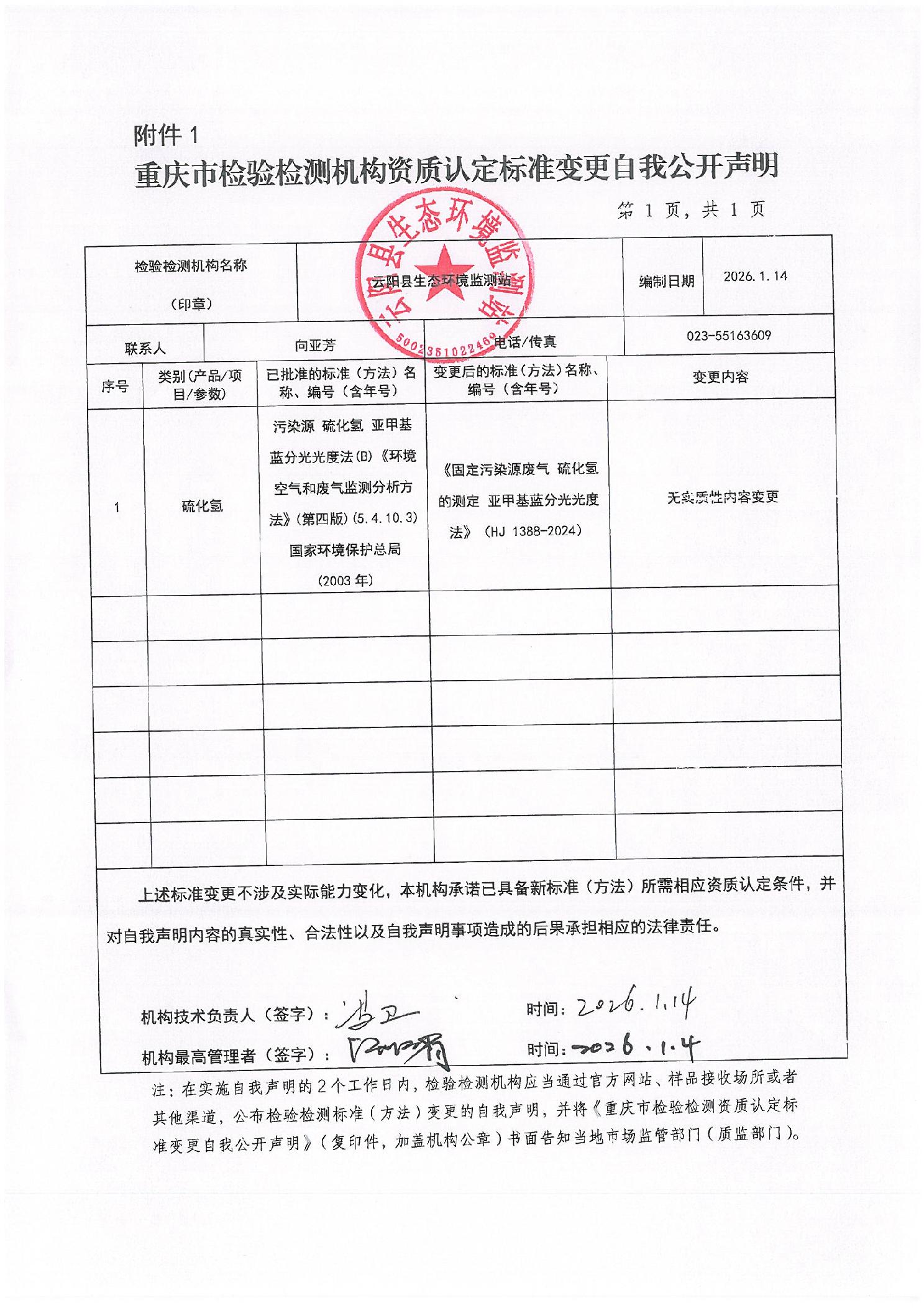 重庆市检验检测资质认定标准变更自我公开声明(硫化氢、建筑施工场界环境噪声)