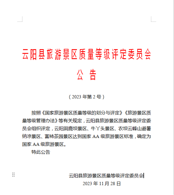 近日,云阳县旅游景区质量等级评定委员和云阳县旅游星级饭店评定委员会发布公示,根据国家标准《旅游景区质量等级的划分与评定》《旅游景区质量等级管理办法》《国家旅游饭店星级的划分与评定》等有关规定,经评定: