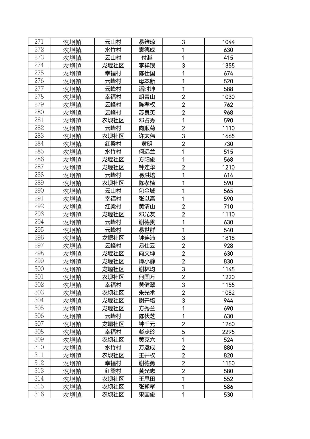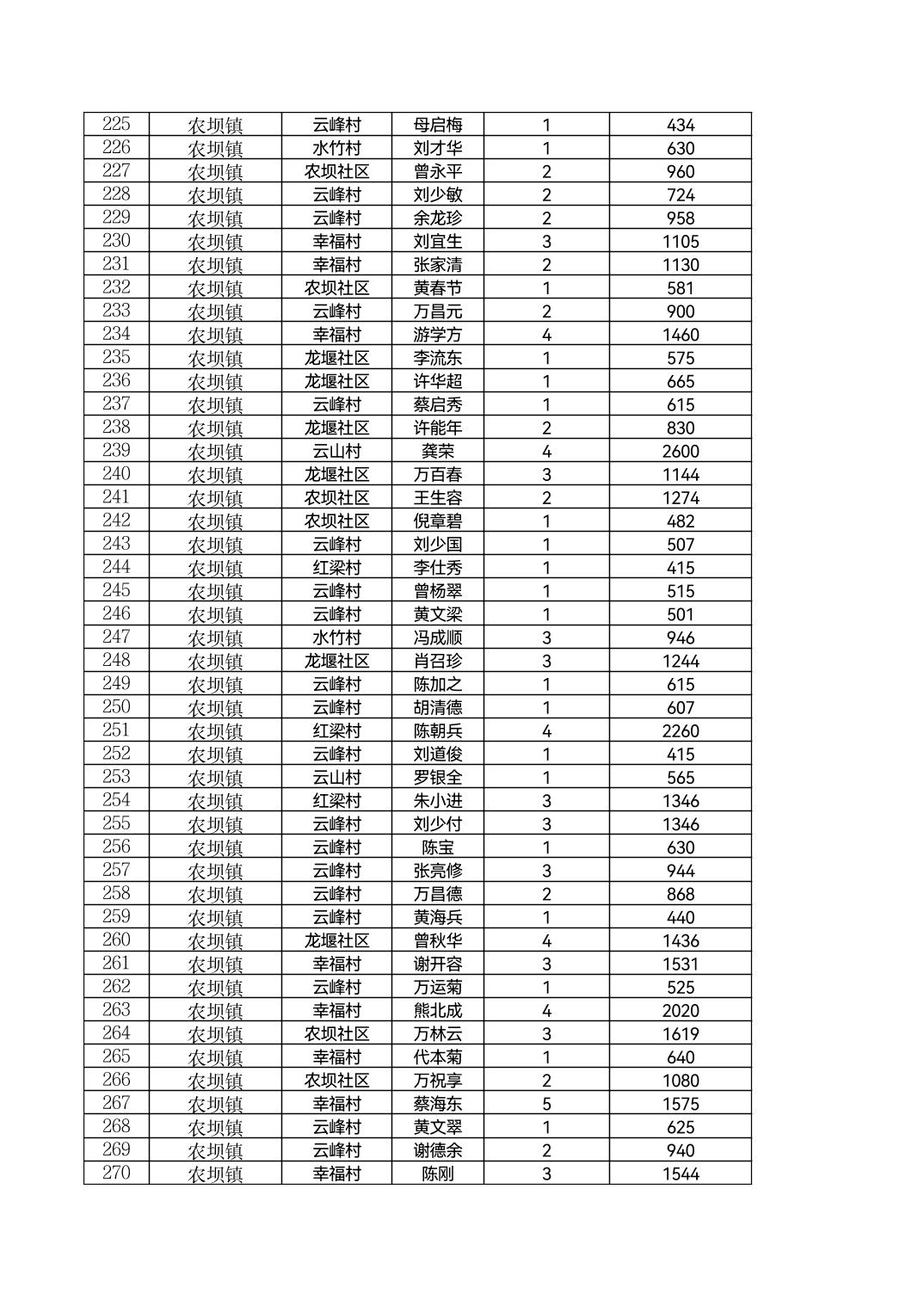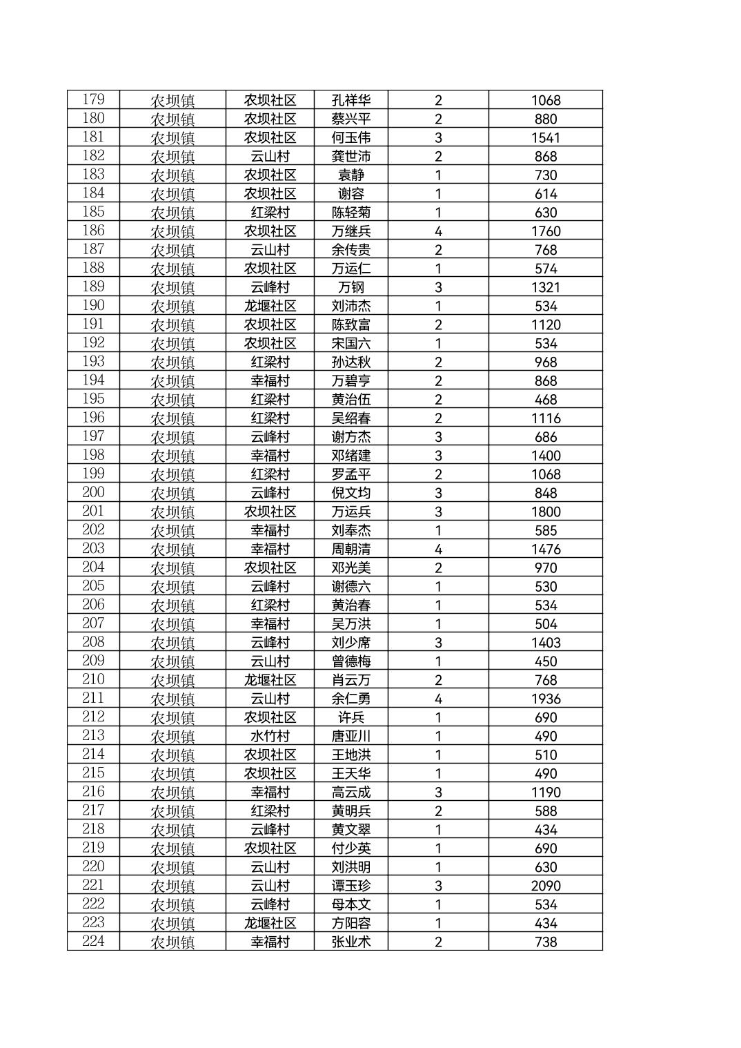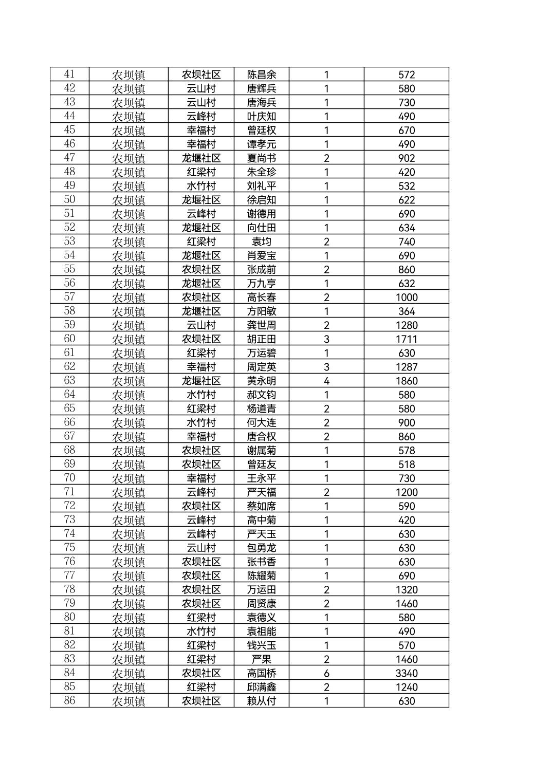 云阳县农坝镇2026年2月农村低保花名