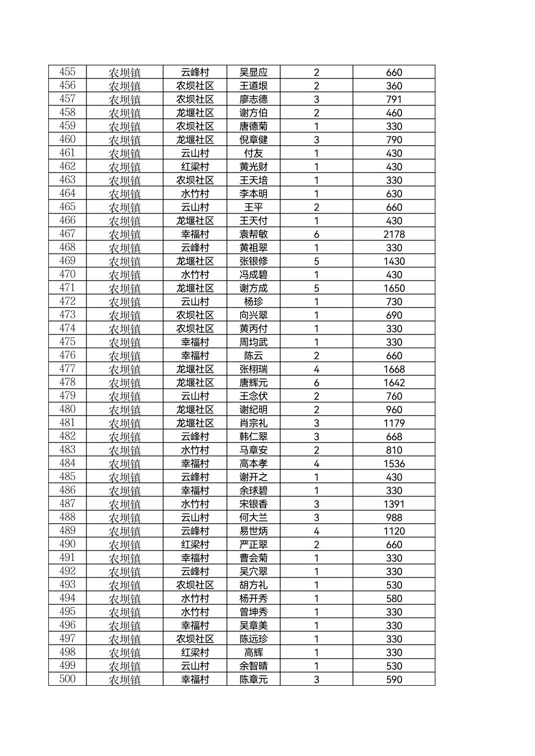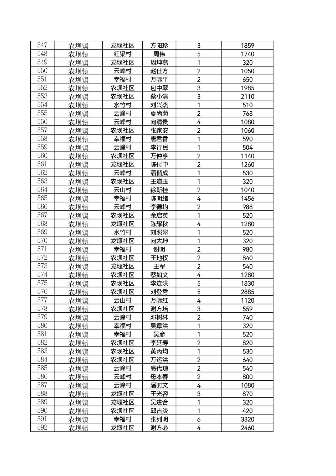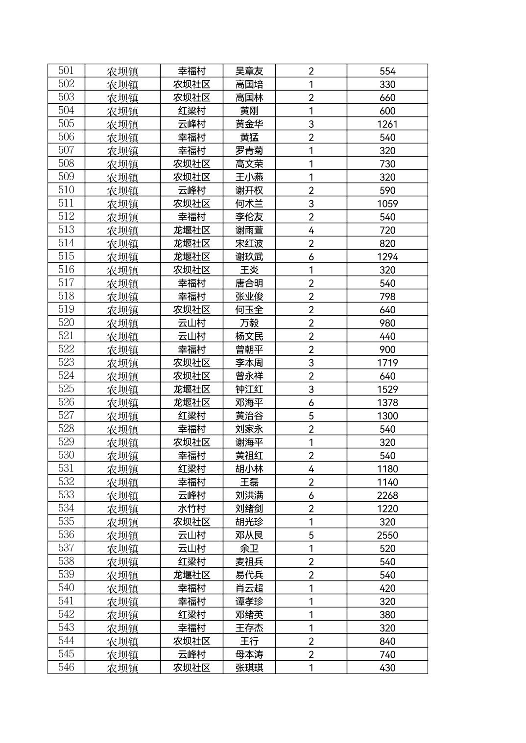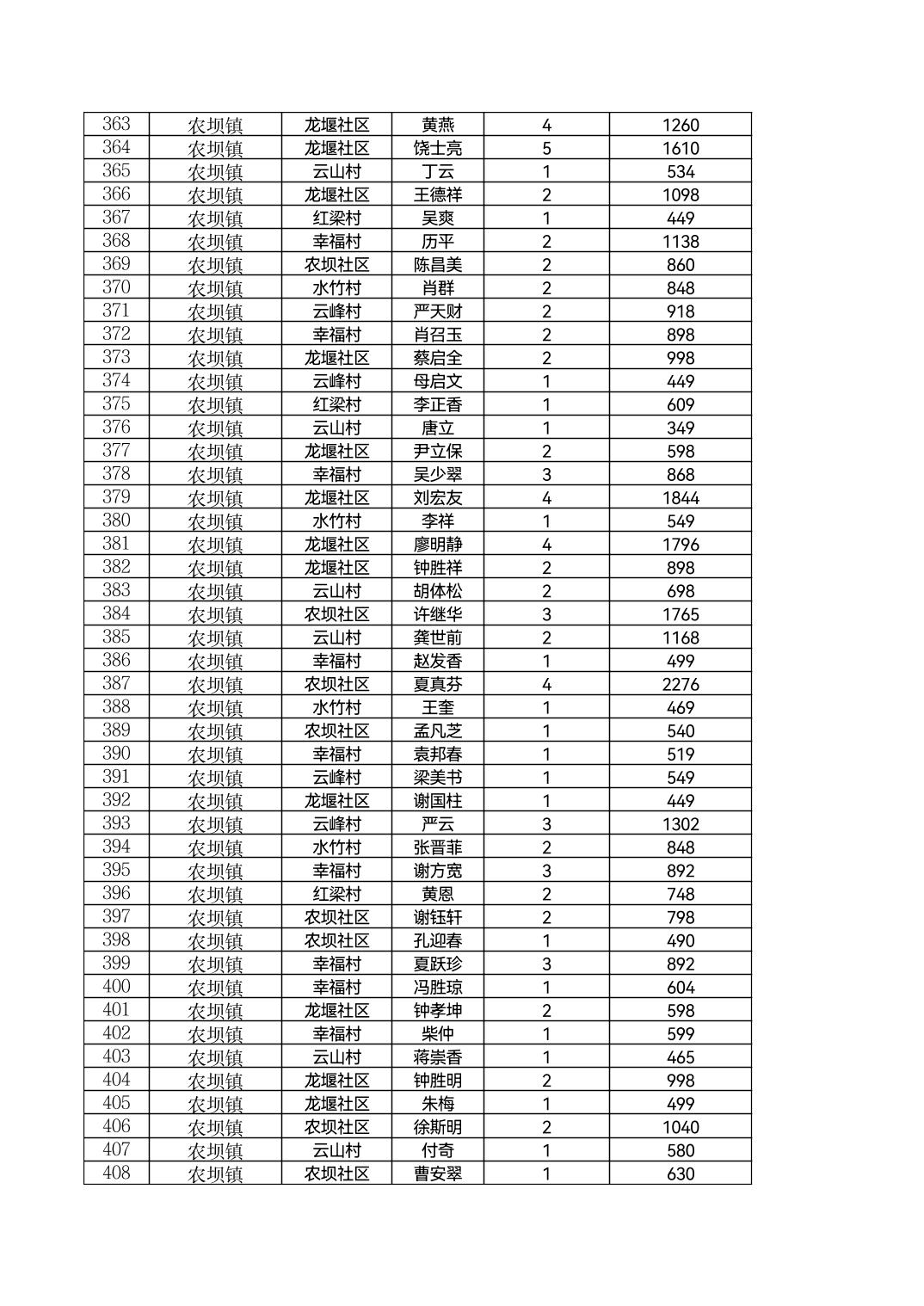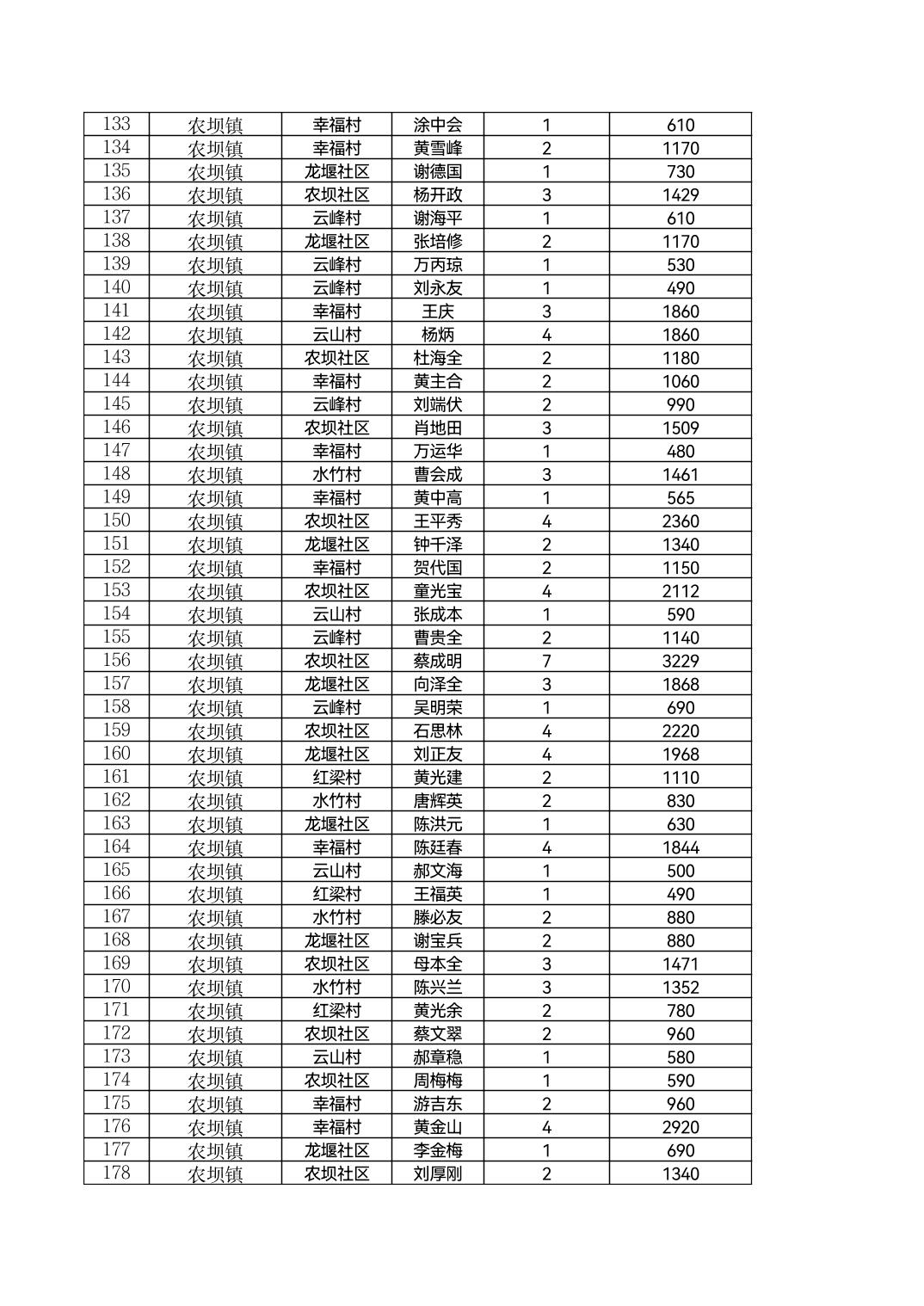 云阳县农坝镇2026年2月农村低保花名