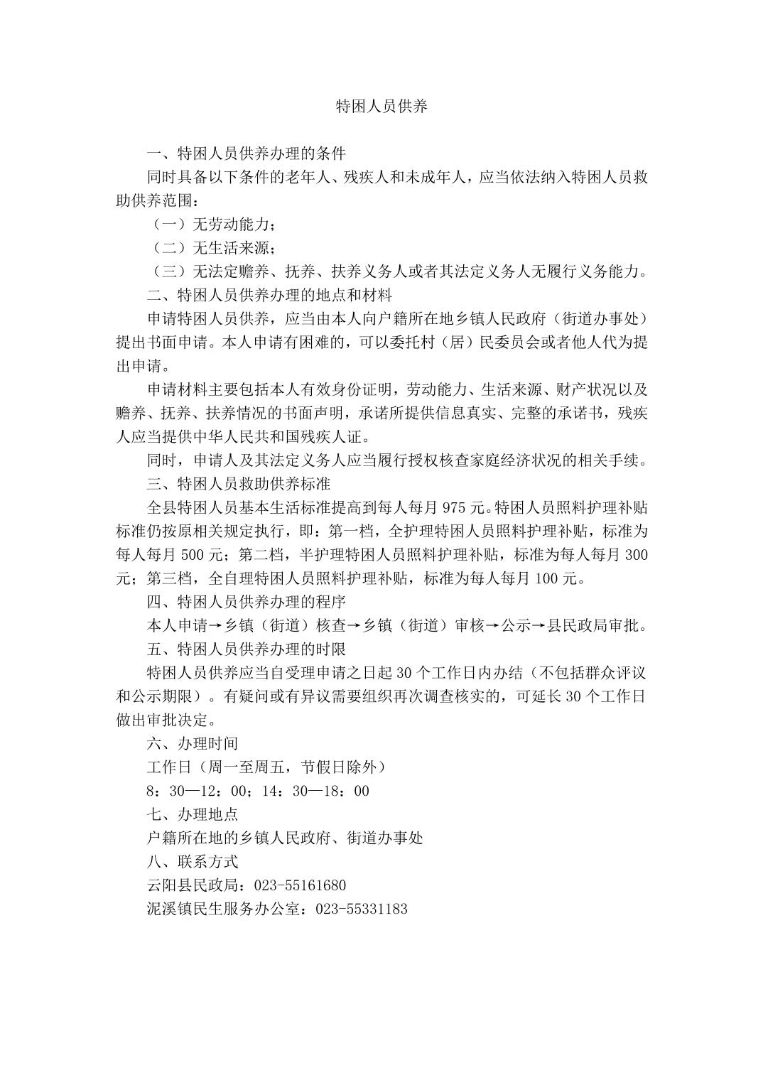 云阳县泥溪镇特困人员供养服务指南
