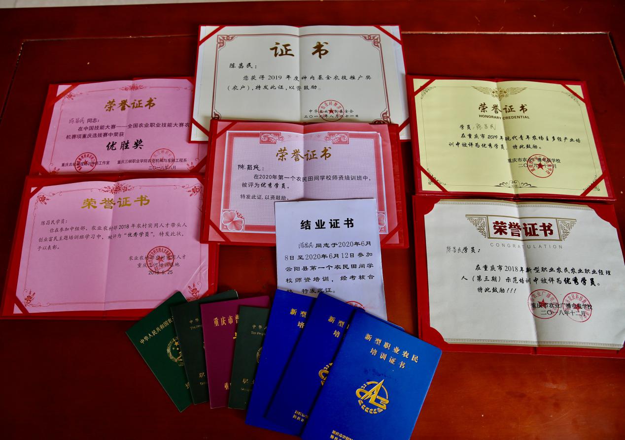 稻谷烘干机、打包机、2台农业无人机、增购2台收割机、再添2台耕地拖拉机……忙碌的机械“发烧友”陈昌民索性住在了厂房里。“机器刚到我就开进地里操作,有培训课我就参加,平时我就自学。”凭着这一股子干劲,陈昌民成了机械操作能手,2018年还荣获了年度中国技能大赛——全国农业职业技能大赛农机赛项重庆选拔赛优胜奖。