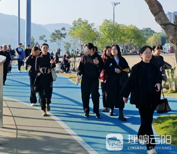 下午三点,清风广场上人头攒动,身着统一运动装的职工们精神饱满,在合影留念后,随着出发指令,徒步队伍正式启程。徒步路线从清风广场出发,串联起阳光沙滩、在水一方、月光草坪等环湖绿道上的标志性景点。3.5公里的路程,不仅是一次体能锻炼,更是一场视觉盛宴。活动中,职工们暂时放下繁忙的工作,结伴而行,欢声笑语回荡在湖光山色之间。有人步履矫健,在运动中感受酣畅淋漓;有人放缓步伐,用手机捕捉着波光粼粼的湖面、金黄柔软的沙滩和如诗如画的草坪秋色。一个个镜头定格下的,不仅是身边同事的笑脸,更是“云阳见面”品牌下,辖区日新月异的宜居环境和生态建设成果。