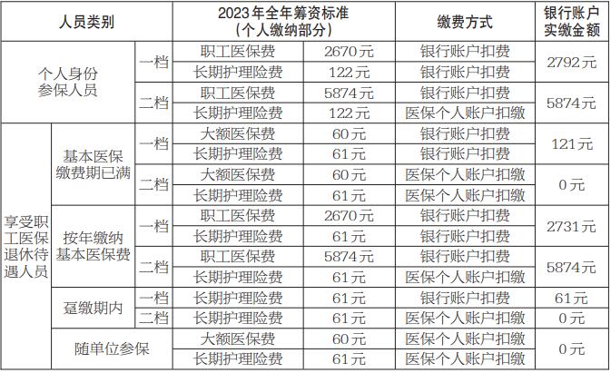 2023年,以个人身份参加职工医保人员和正常享受职工医保退休待遇人员长期护理保险缴费标准为122元/年·人。个人身份参加职工医保人员全额缴纳122元,正常享受职工医保退休待遇人员个人缴纳61元、医保基金划拨61元。以个人身份参加职工医保一档人员在按年缴纳职工医保费(或职工大额医保费)时同步一次性缴纳;其余人员通过个人账户代扣代缴。