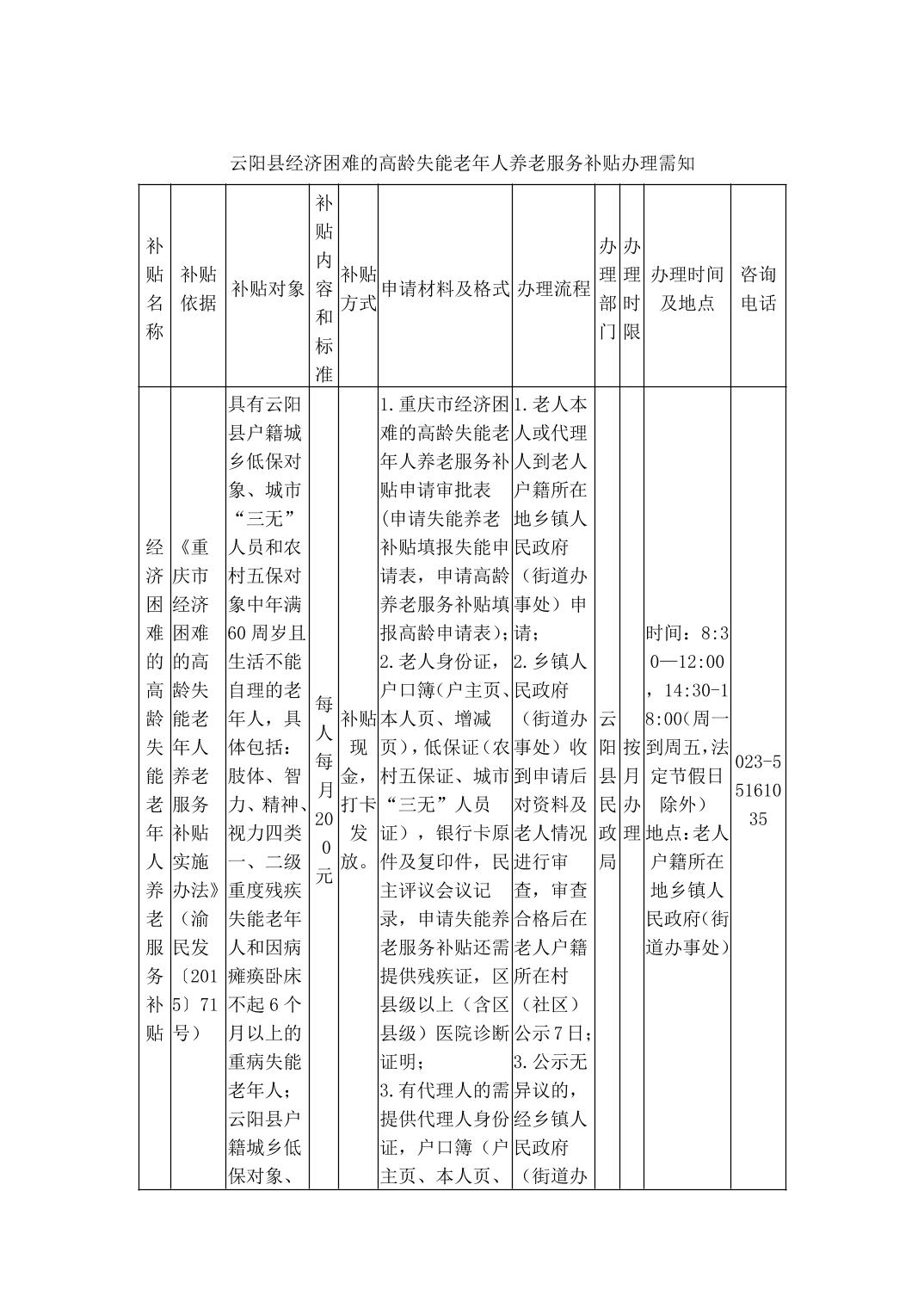 云阳县经济困难的高龄失能老年人养老服务补贴办理需知