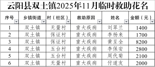 云阳县双土镇2025年11月临时救助花名