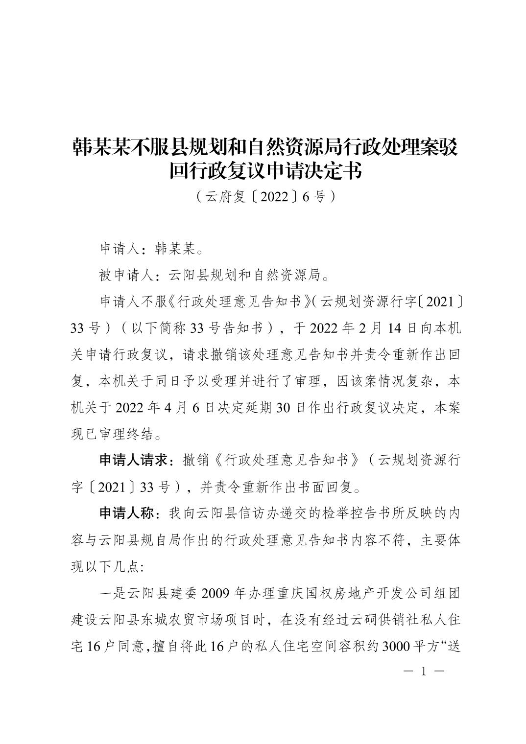 申请人不服《行政处理意见告知书》(云规划资源行字〔2021〕33号)(以下简称33号告知书),于2022年2月14日向本机关申请行政复议,请求撤销该处理意见告知书并责令重新作出回复,本机关于同日予以受理并进行了审理,因该案情况复杂,本机关于2022年4月6日决定延期30日作出行政复议决定,本案现已审理终结。