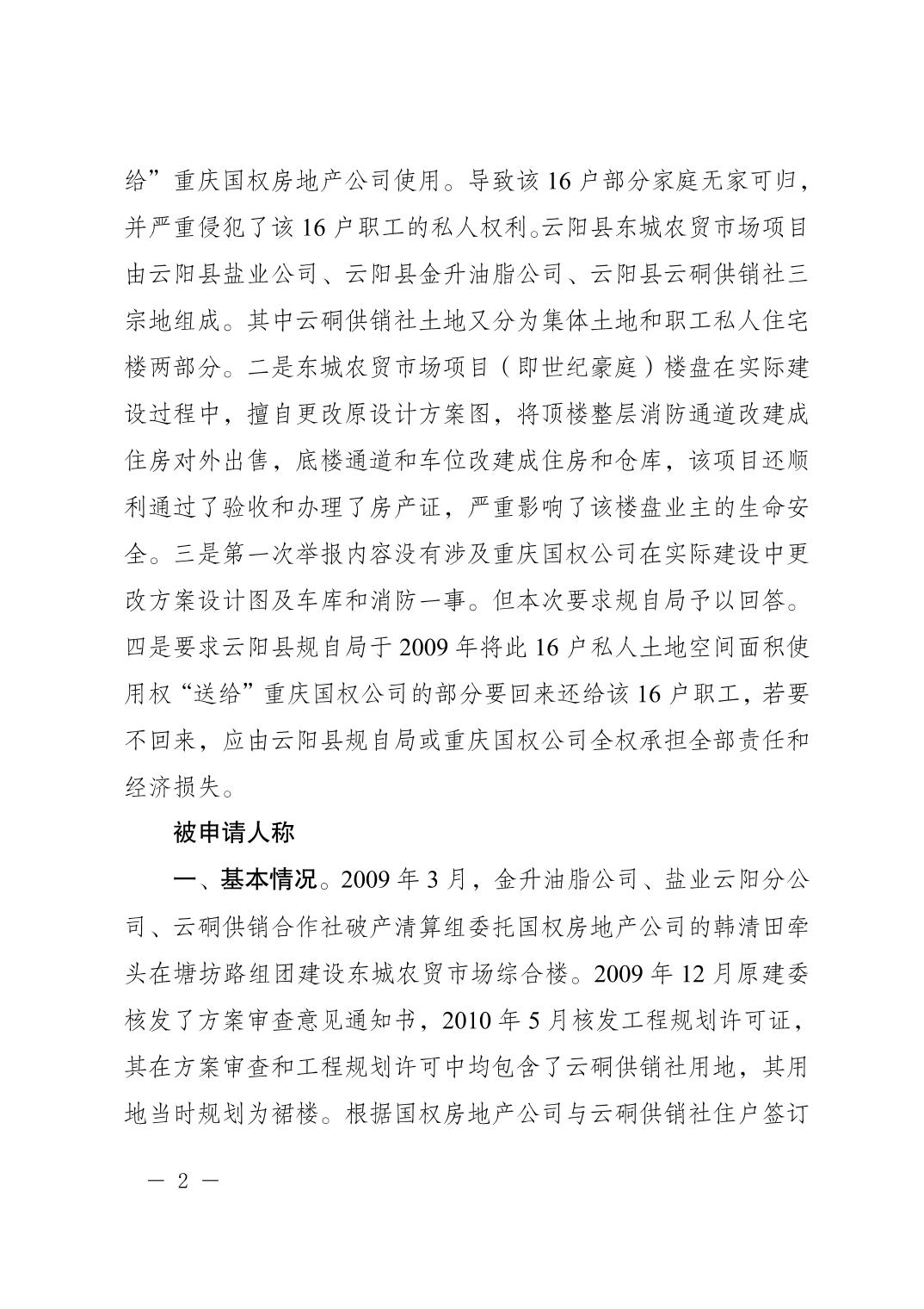 一是云阳县建委2009年办理重庆国权房地产开发公司组团建设云阳县东城农贸市场项目时,在没有经过云硐供销社私人住宅16户同意,擅自将此16户的私人住宅空间容积约3000平方“送给”重庆国权房地产公司使用。导致该16户部分家庭无家可归,并严重侵犯了该16户职工的私人权利。云阳县东城农贸市场项目由云阳县盐业公司、云阳县金升油脂公司、云阳县云硐供销社三宗地组成。其中云硐供销社土地又分为集体土地和职工私人住宅楼两部分。二是东城农贸市场项目(即世纪豪庭)楼盘在实际建设过程中,擅自更改原设计方案图,将顶楼整层消防通道改建成住房对外出售,底楼通道和车位改建成住房和仓库,该项目还顺利通过了验收和办理了房产证,严重影响了该楼盘业主的生命安全。三是第一次举报内容没有涉及重庆国权公司在实际建设中更改方案设计图及车库和消防一事。但本次要求规自局予以回答。四是要求云阳县规自局于2009年将此16户私人土地空间面积使用权“送给”重庆国权公司的部分要回来还给该16户职工,若要不回来,应由云阳县规自局或重庆国权公司全权承担全部责任和经济损失。
