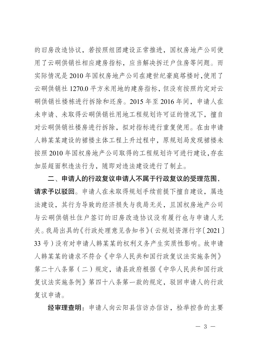 二、申请人的行政复议申请人不属于行政复议的受理范围,请求予以驳回。申请人在未取得规划手续前提下擅自建设,属违法建设,其行为导致的经济损失与我局无关,且国权房地产公司与云硐供销社住户签订的旧房改造协议没有履行也与申请人无关。我局出具的《行政处理意见告知书》(云规划资源行字〔2021〕33号)没有对申请人韩某某的权利义务产生实质性影响。故申请人韩某某的请求不符合《中华人民共和国行政复议法实施条例》第二十八条第(二)规定,请县政府根据《中华人民共和国行政复议法实施条例》第四十八条第一款的规定,驳回申请人的行政复议申请。