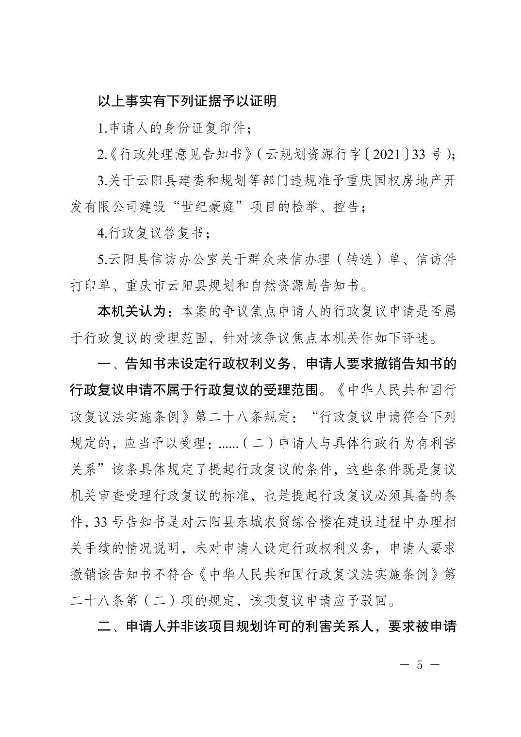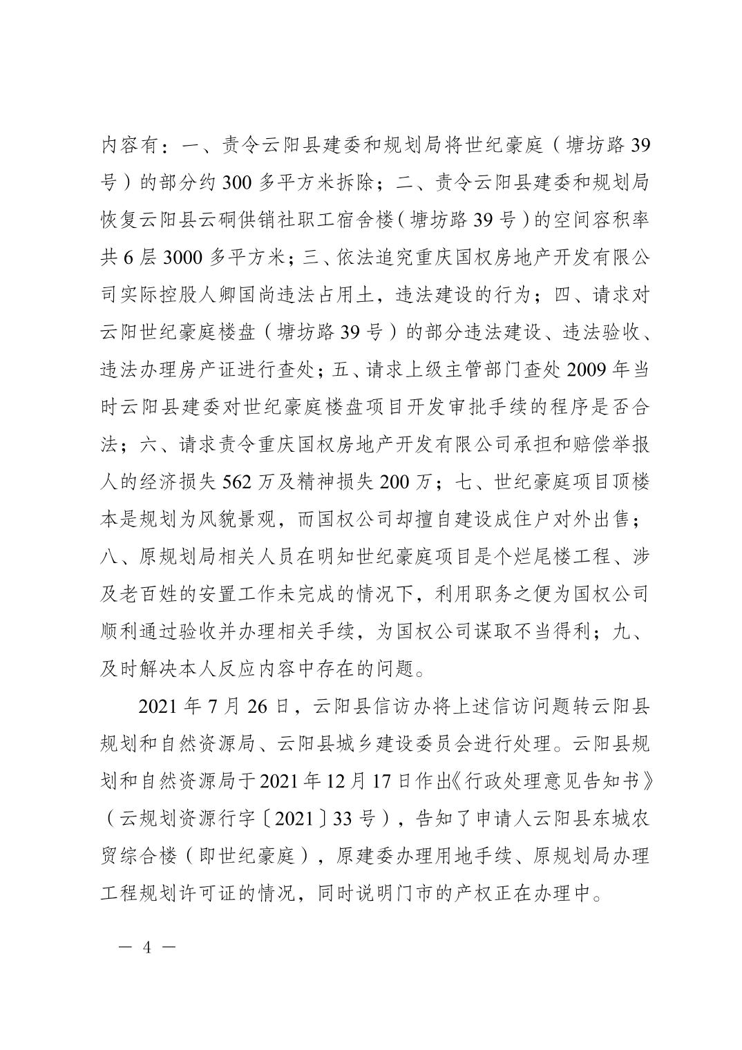 3.关于云阳县建委和规划等部门违规准予重庆国权房地产开发有限公司建设“世纪豪庭”项目的检举、控告;