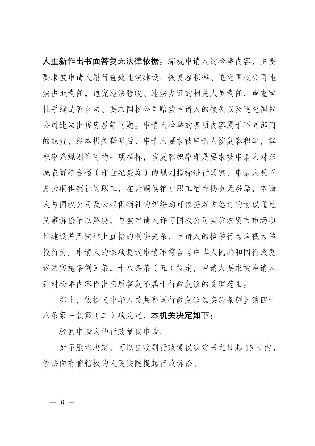 二、申请人并非该项目规划许可的利害关系人,要求被申请人重新作出书面答复无法律依据。纵观申请人的检举内容,主要要求被申请人履行查处违法建设、恢复容积率、追究国权公司违法占地责任,追究违法验收、违法办证的相关人员责任,审查审批手续是否合法、要求国权公司赔偿申请人的损失以及追究国权公司违法出售房屋等问题。申请人检举的多项内容属于不同部门的职责,经本机关释明后,申请人要求被申请人恢复容积率,容积率系规划许可的一项指标,恢复容积率即是要求被申请人对东城农贸综合楼(即世纪豪庭)的规划指标进行调整;申请人既不是云硐供销社的职工,在云硐供销社职工宿舍楼也无房屋,申请人与国权公司及云硐供销社的纠纷均可依据双方签订的协议通过民事诉讼予以解决,与被申请人许可国权公司实施农贸市市场项目建设并无法律上直接的利害关系,申请人的检举行为应视为举报行为。申请人的该项复议申请不符合《中华人民共和国行政复议法实施条例》第二十八条第(五)规定,申请人要求被申请人针对检举内容作出实质答复不属于行政复议的受理范围。