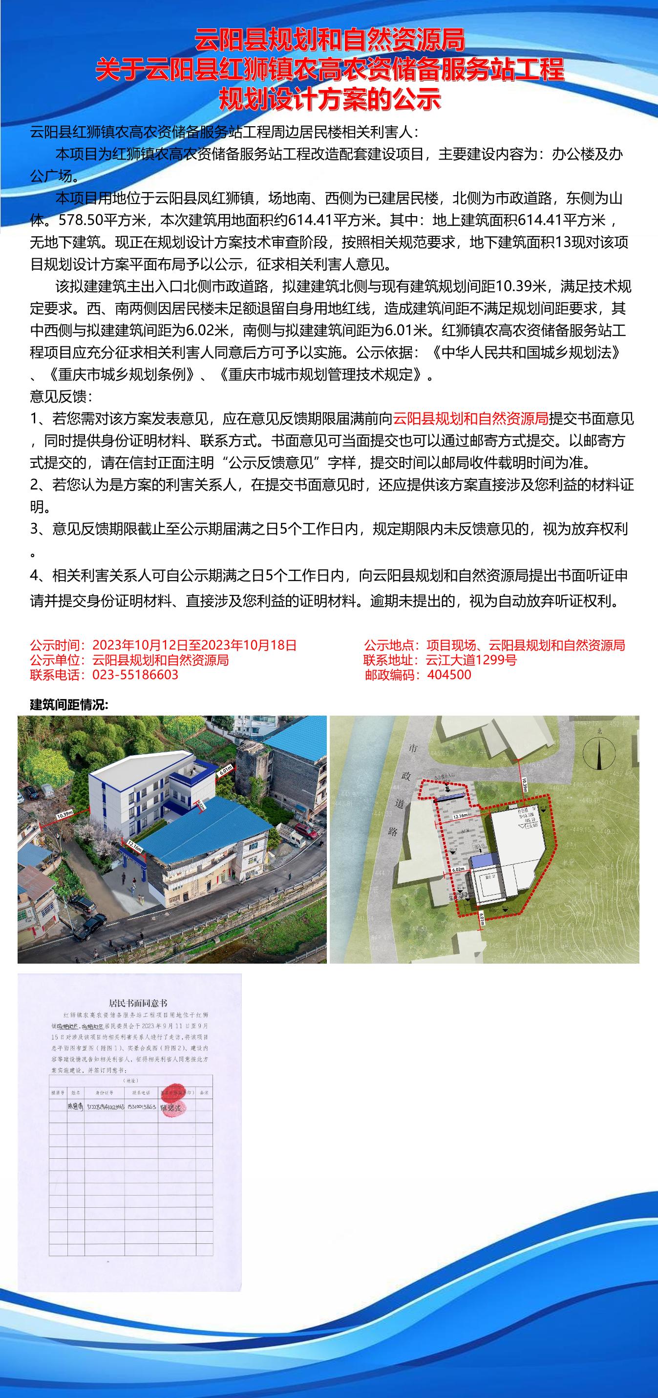 云阳县规划和自然资源局关于云阳县红狮镇农高农资储备服务站工程规划设计方案的公示