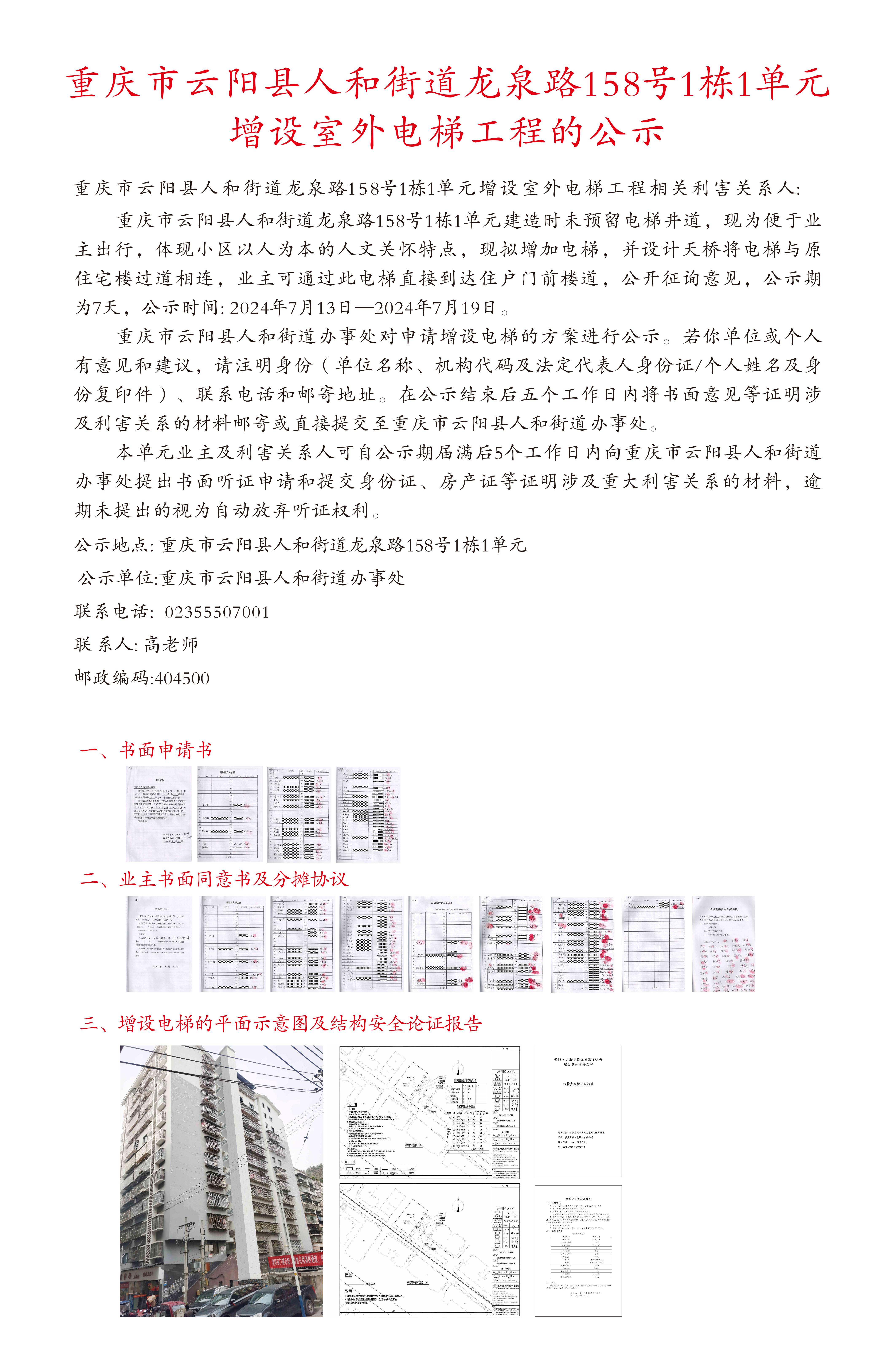 人和街道龙泉路158号1栋1单元增设室外电梯工程的公示