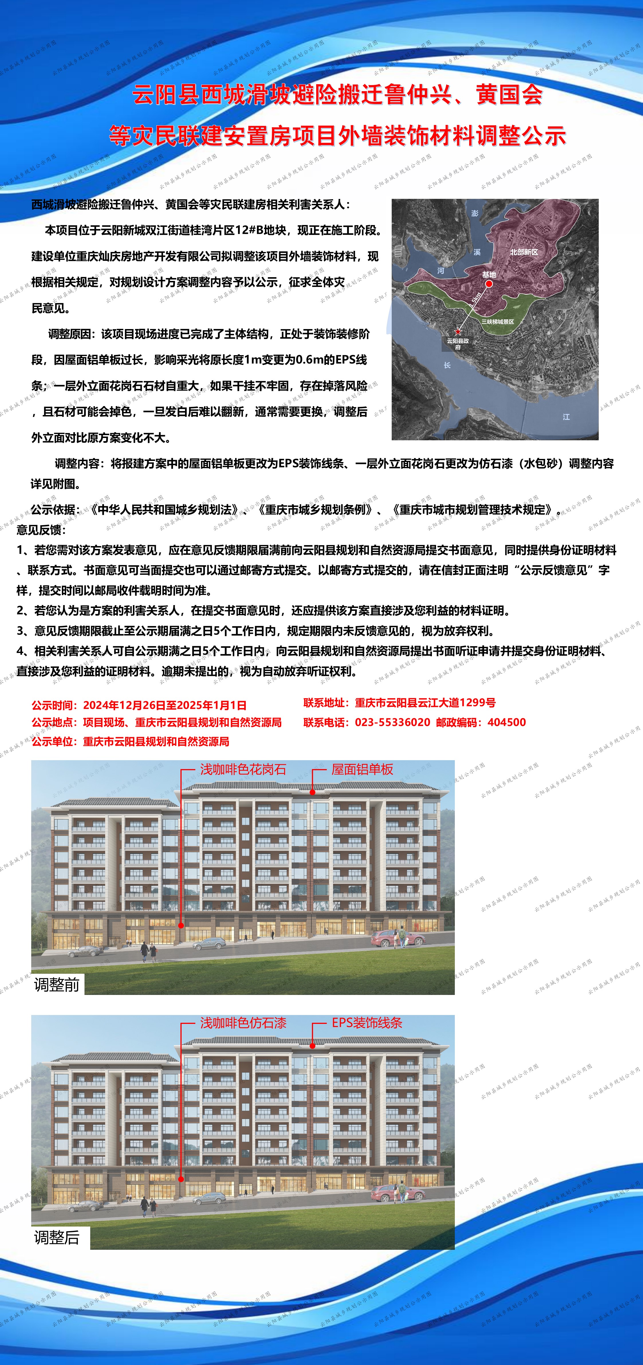 云阳县西城滑坡避险搬迁鲁仲兴、黄国会等灾民联建安置房项目外墙装饰材料调整公示