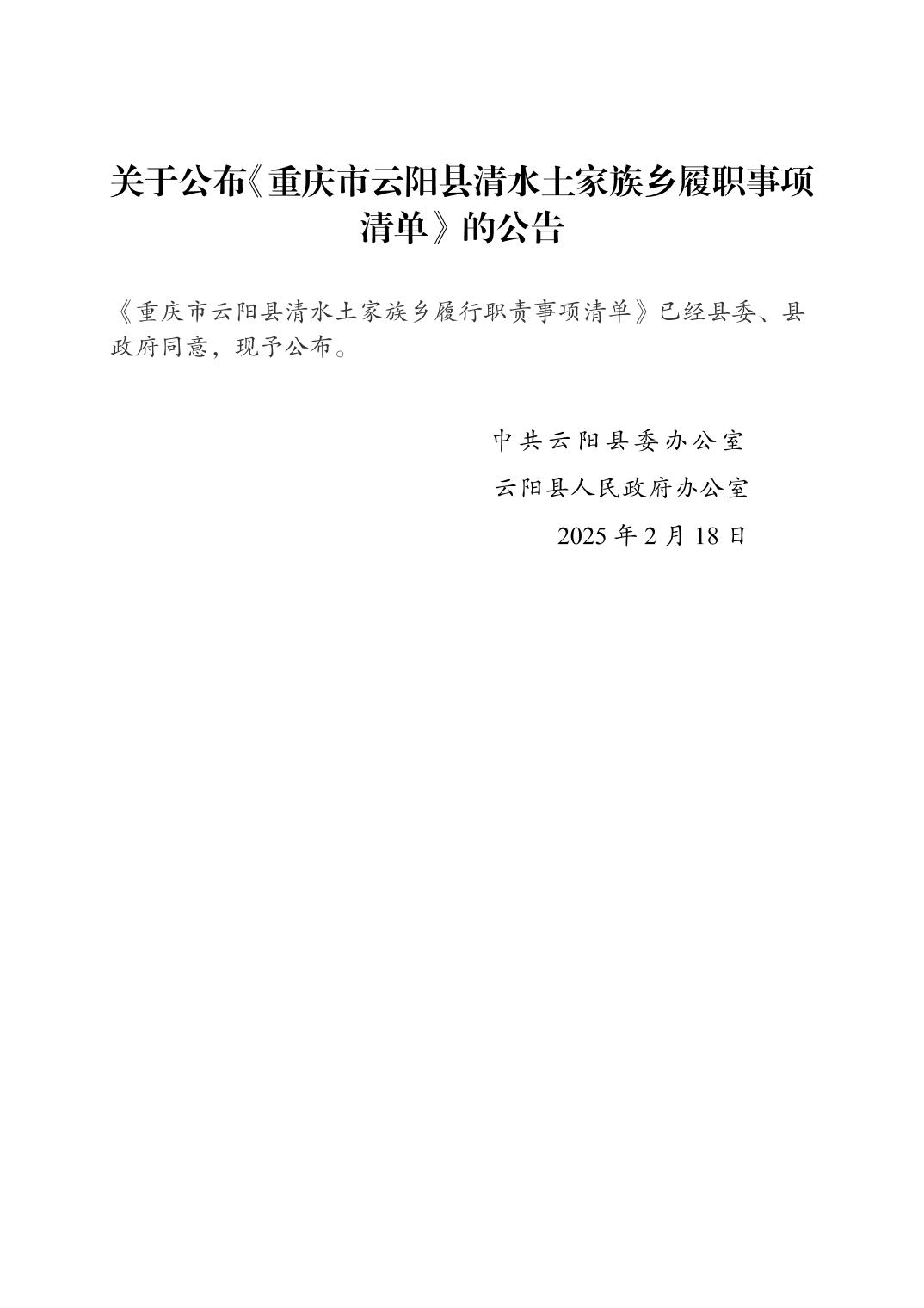 关于公布《重庆市云阳县清水土家族乡履职事项清单》的公告