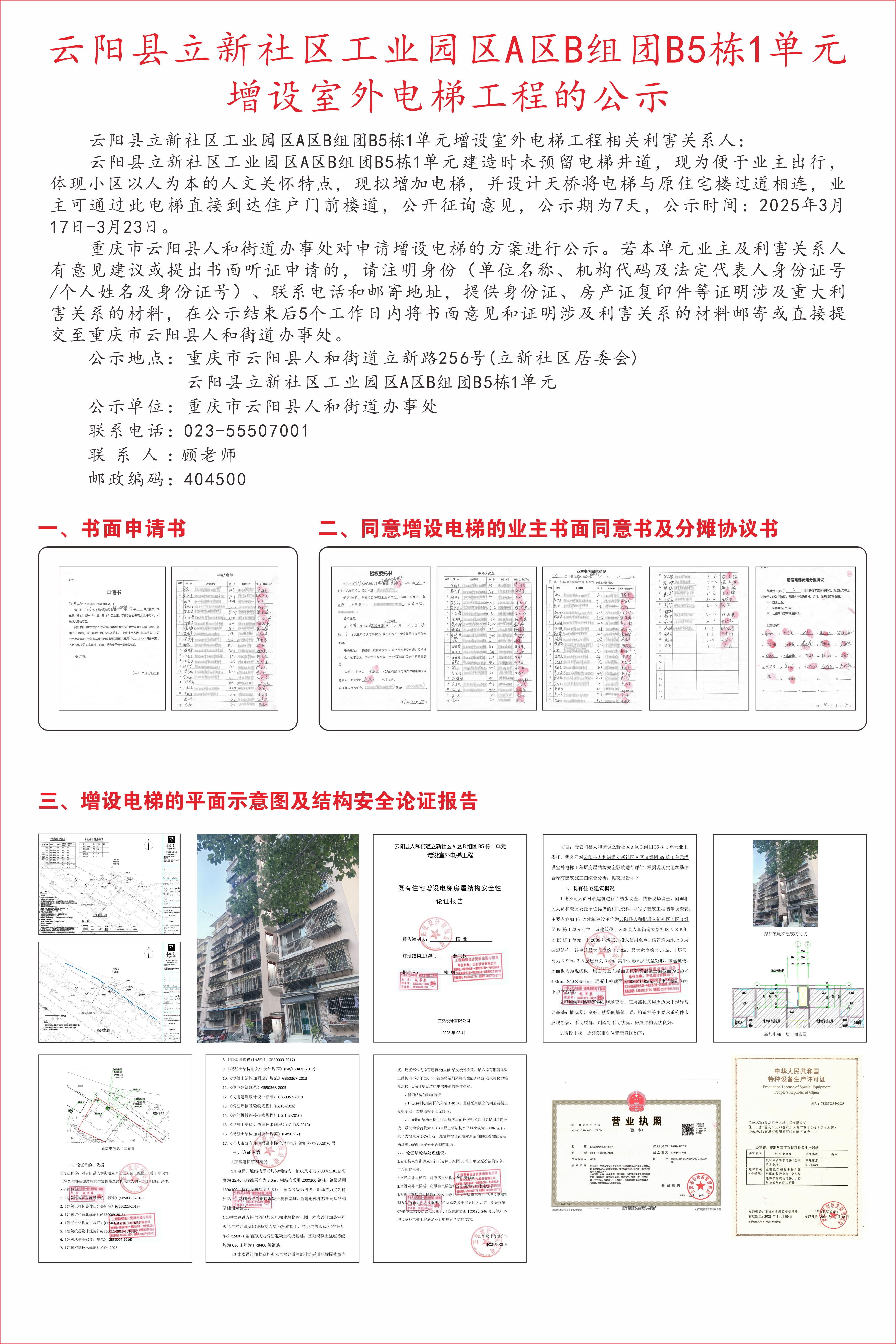 云阳县立新社区工业园区A区B组团B5栋1单元增设室外电梯工程的公示