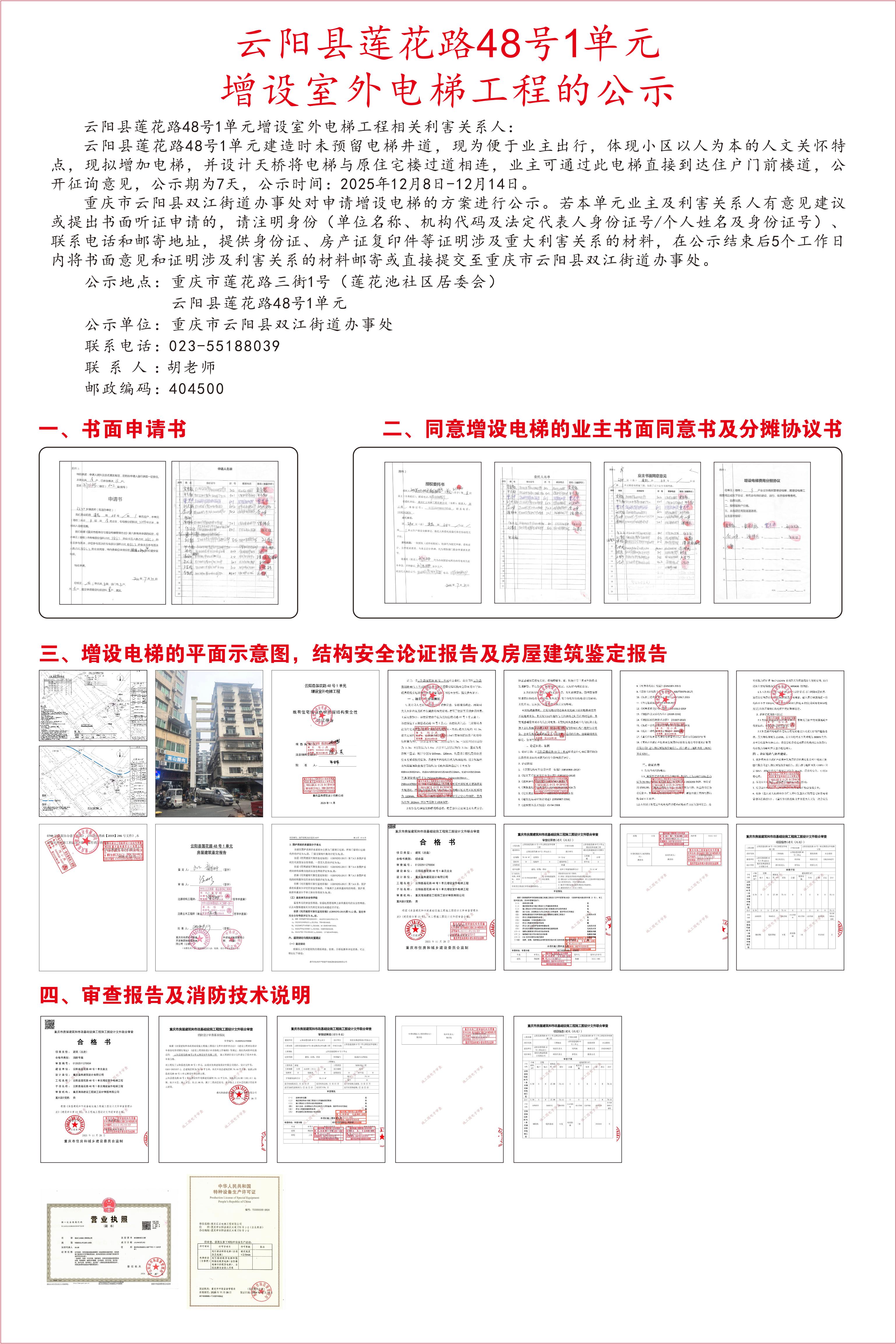 云阳县莲花路48号1单元增设室外电梯工程的公示