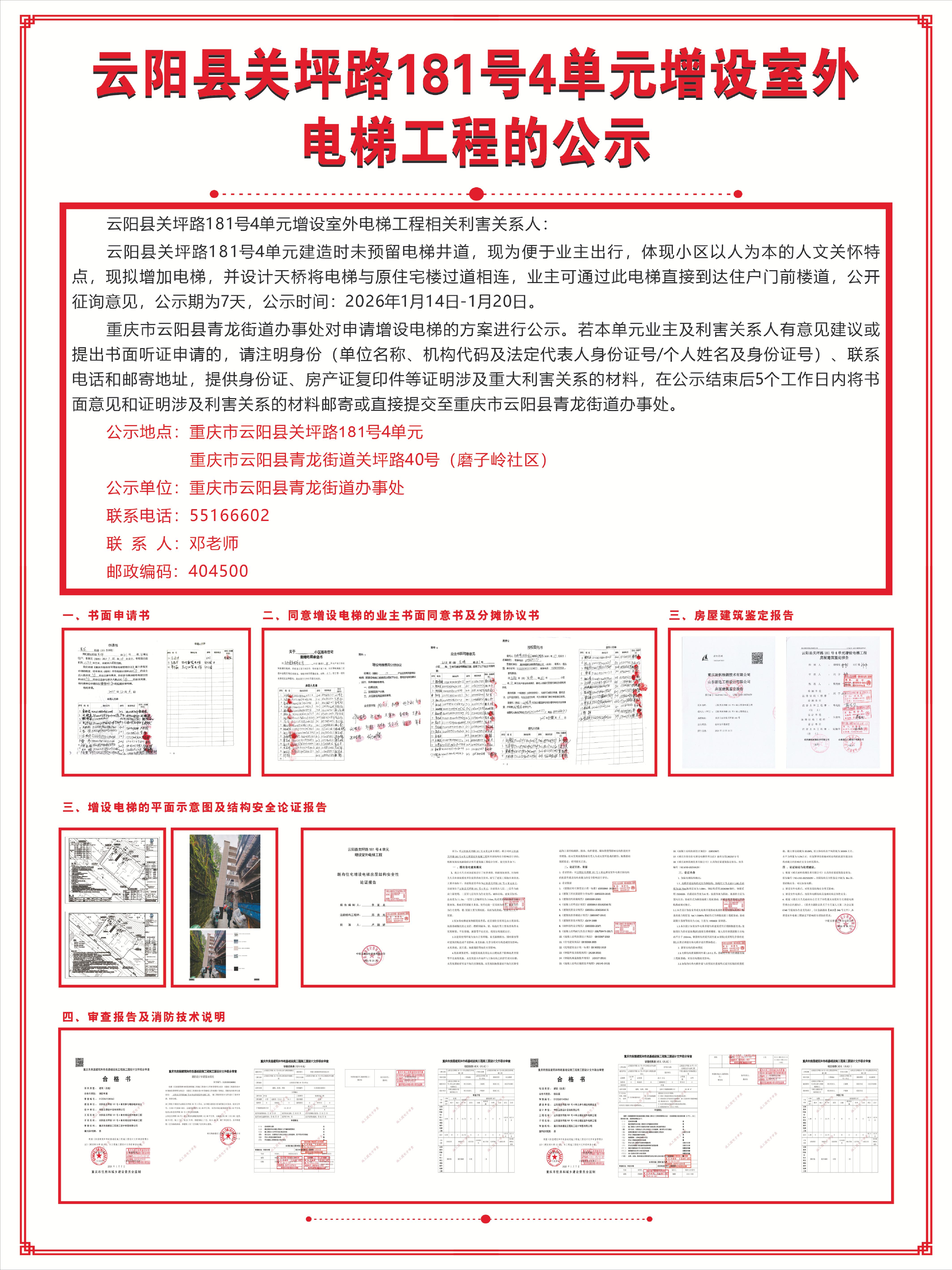 云阳县关坪路181号4单元增设室外电梯工程的公示