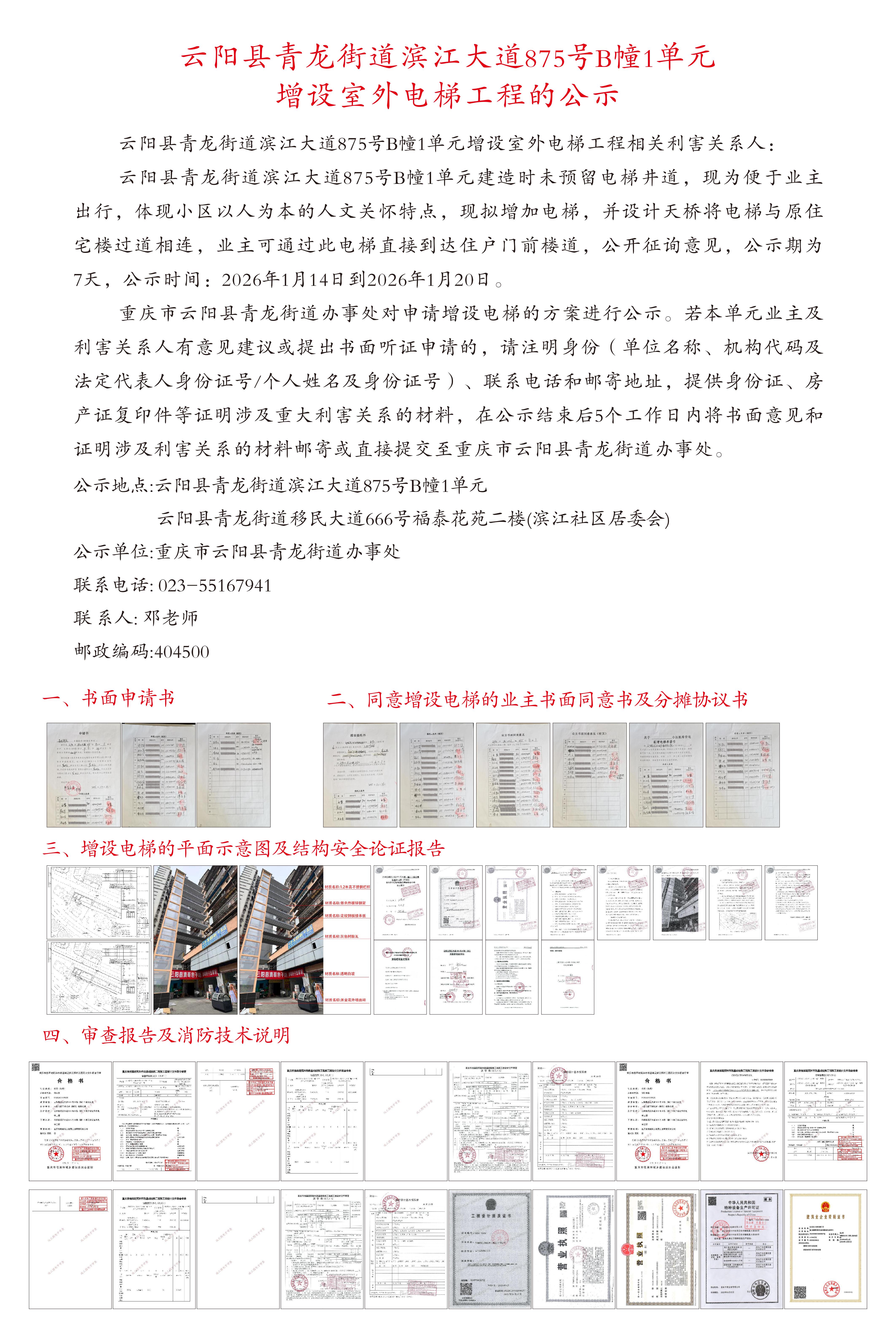 云阳县青龙街道滨江大道875号B幢1单元增设室外电梯工程的公示