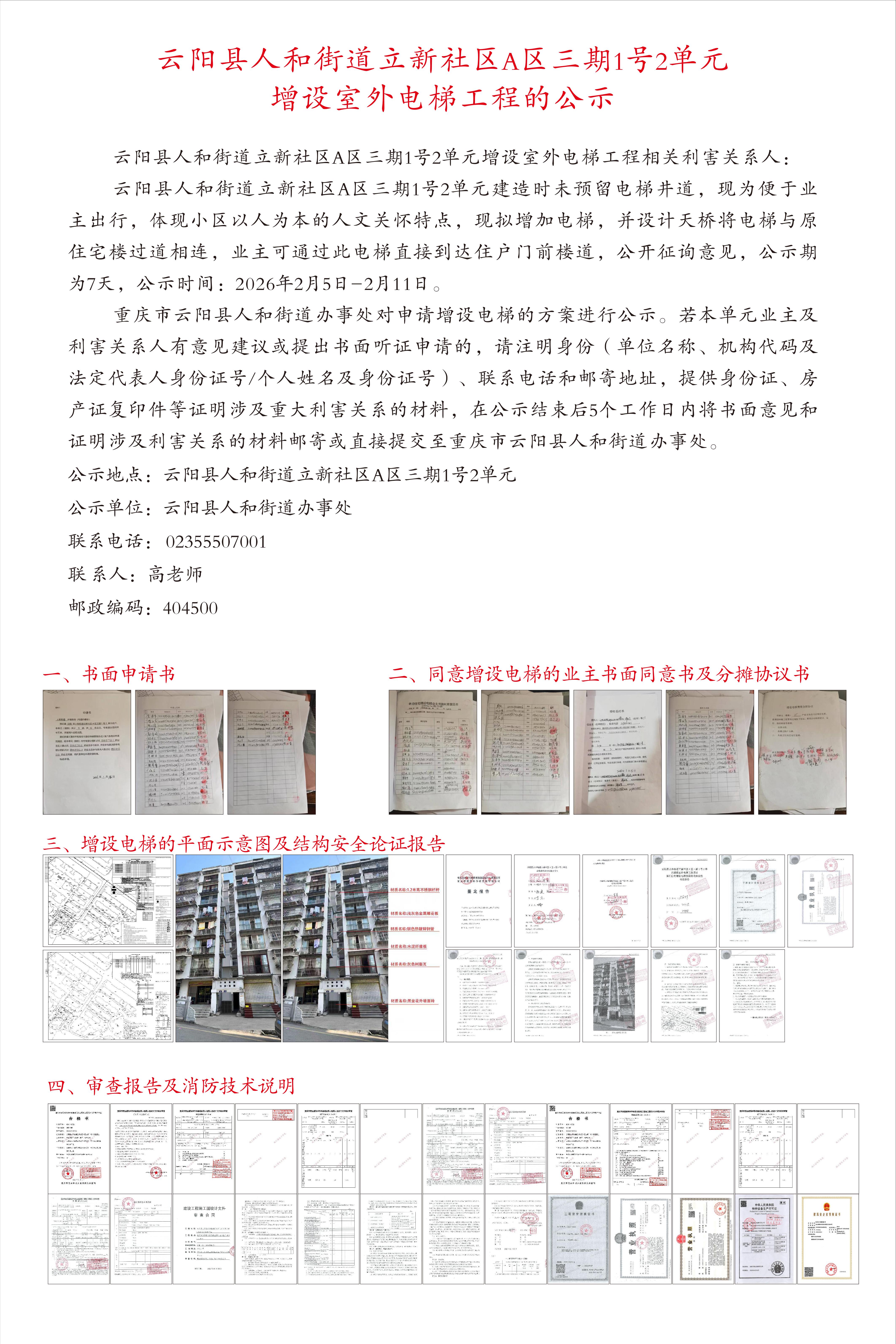云阳县人和街道立新社区A区三期1号2单元增设室外电梯工程的公示