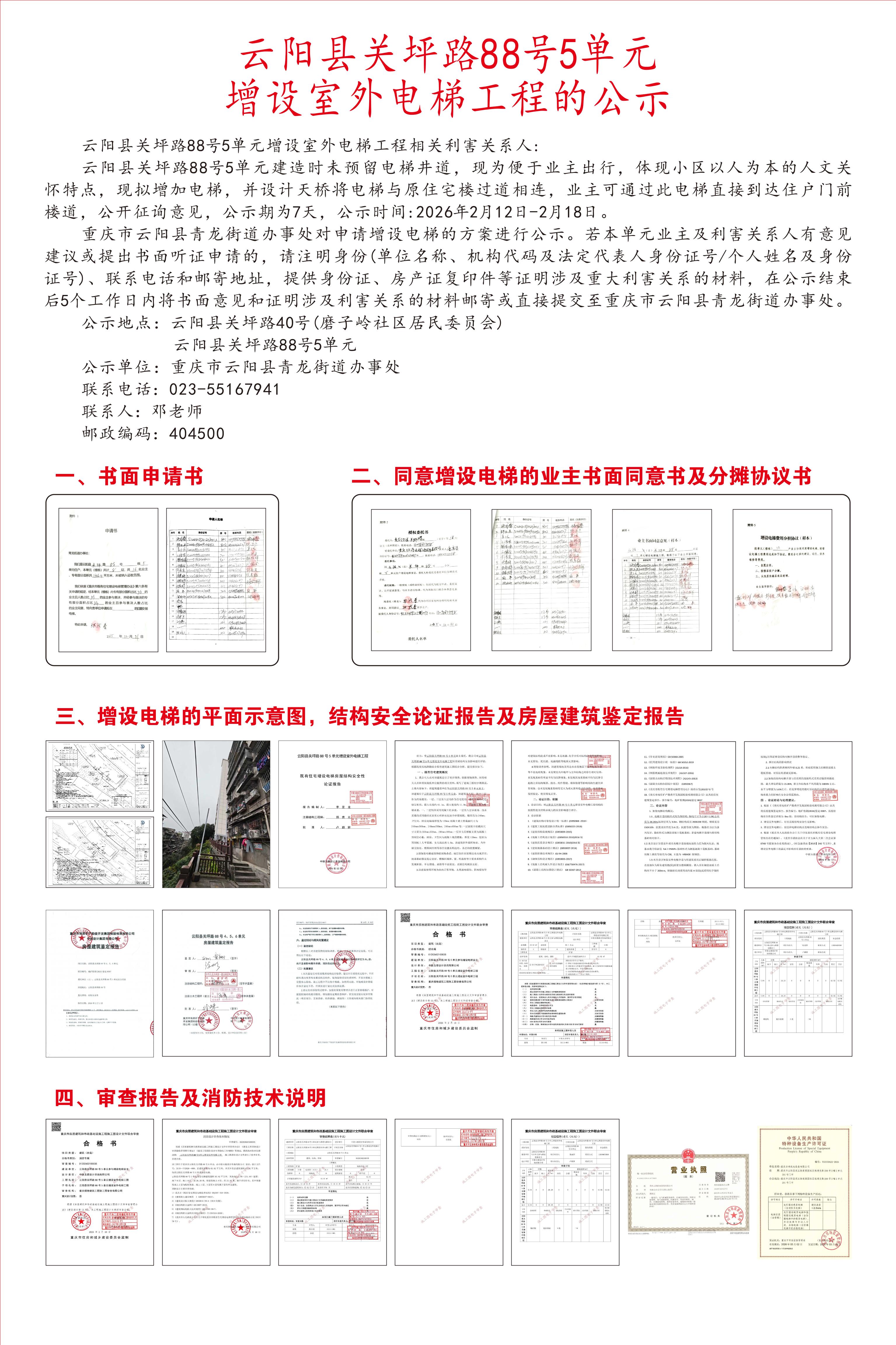 云阳县关坪路88号5单元增设室外电梯工程的公示