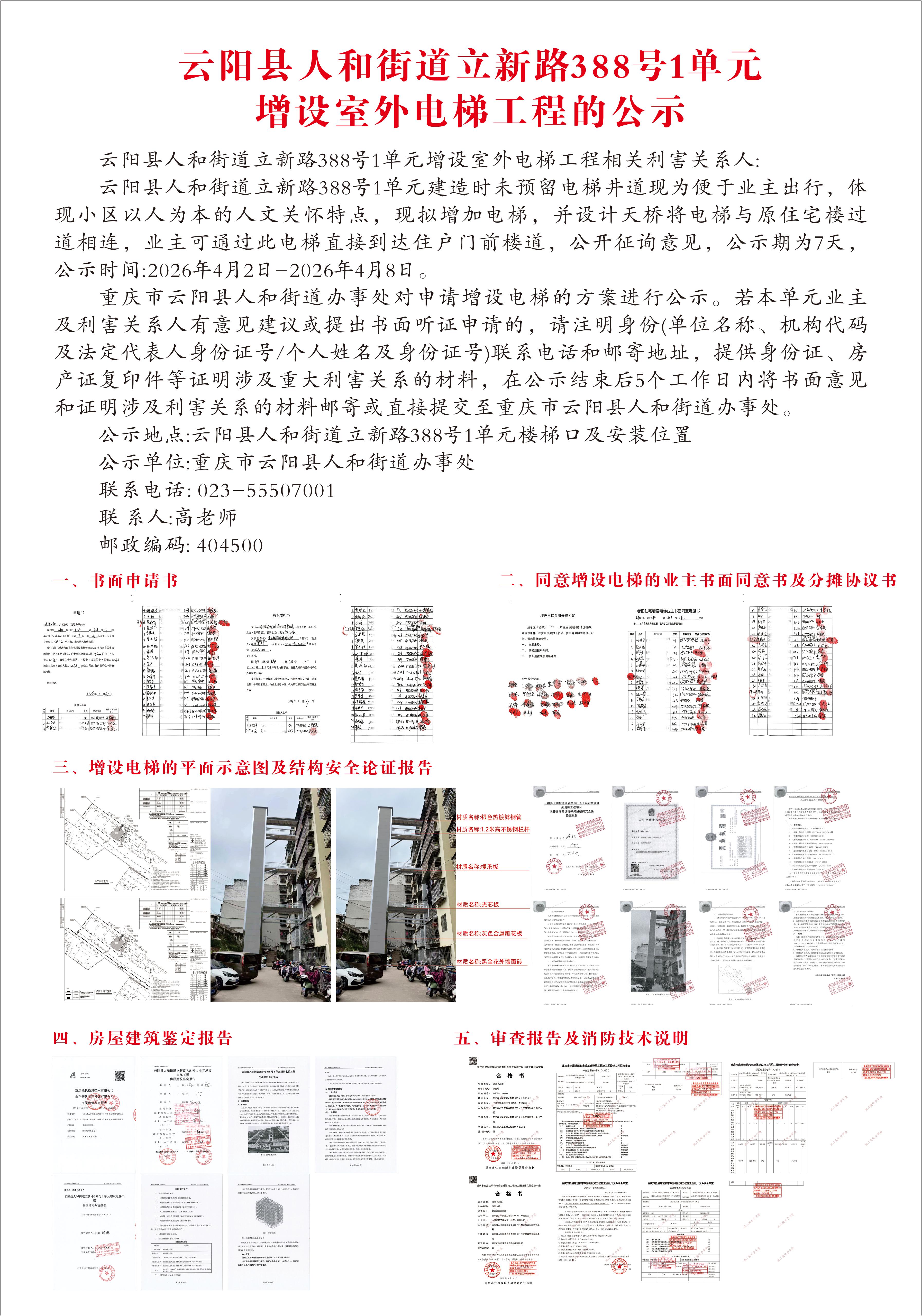 云阳县人和街道立新路388号1单元增设室外电梯工程的公示