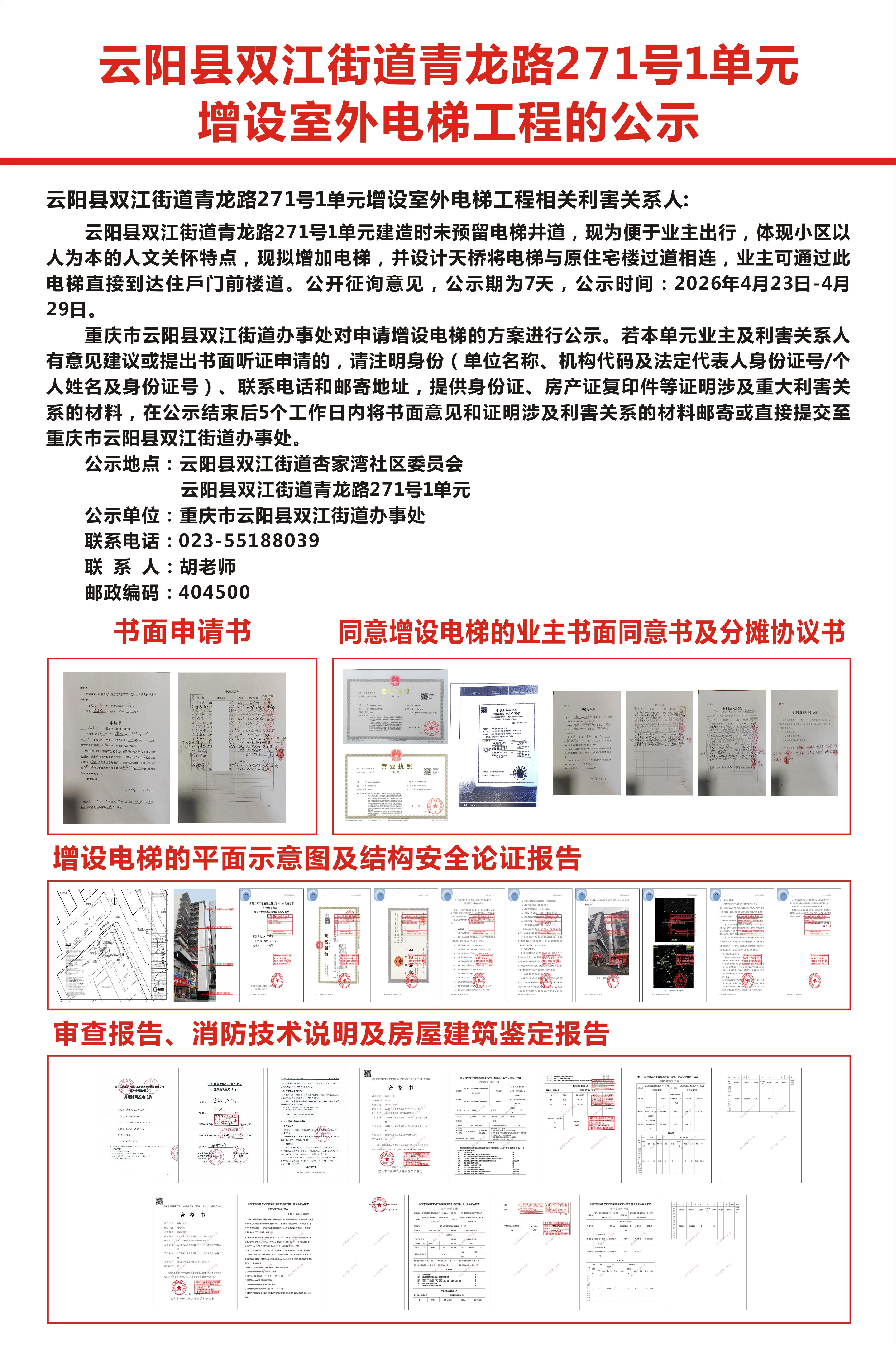 云阳县双江街道青龙路271号1单元增设室外电梯工程的公示