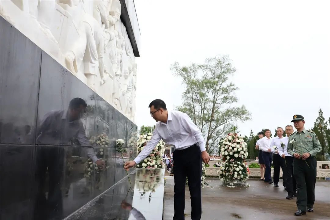 覃昌德神情肃穆,缓步上前,在花篮前驻足凝视,郑重整理花篮上的红色缎带,行三次鞠躬礼,向烈士致敬。