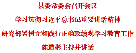 3月4日上午,县委常委会召开会议,深入学习贯彻习近平总书记近期系列重要讲话精神,传达学习中央及市委党的建设工作领导小组会议精神,听取我县开展树立和践行正确政绩观学习教育有关事项汇报,研究部署全县学习教育工作。