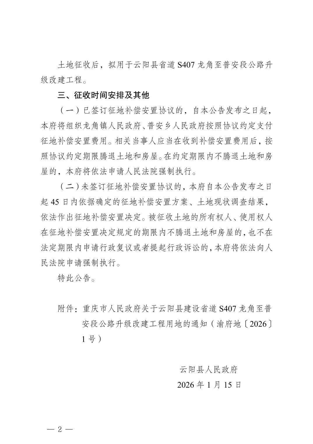 云阳县人民政府关于征收土地的公告( 云阳府征地公告〔2026〕 1号)