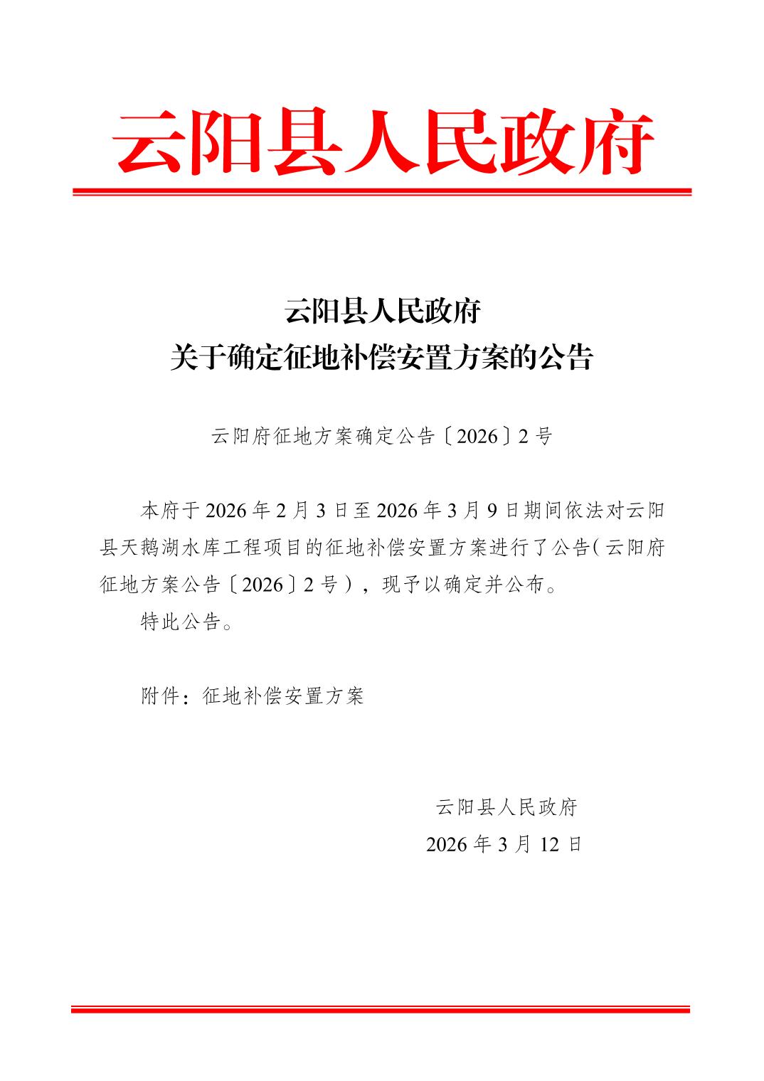 云阳县人民政府关于确定征地补偿安置方案的公告(云阳府征地方案确定公告〔2026〕 2号)