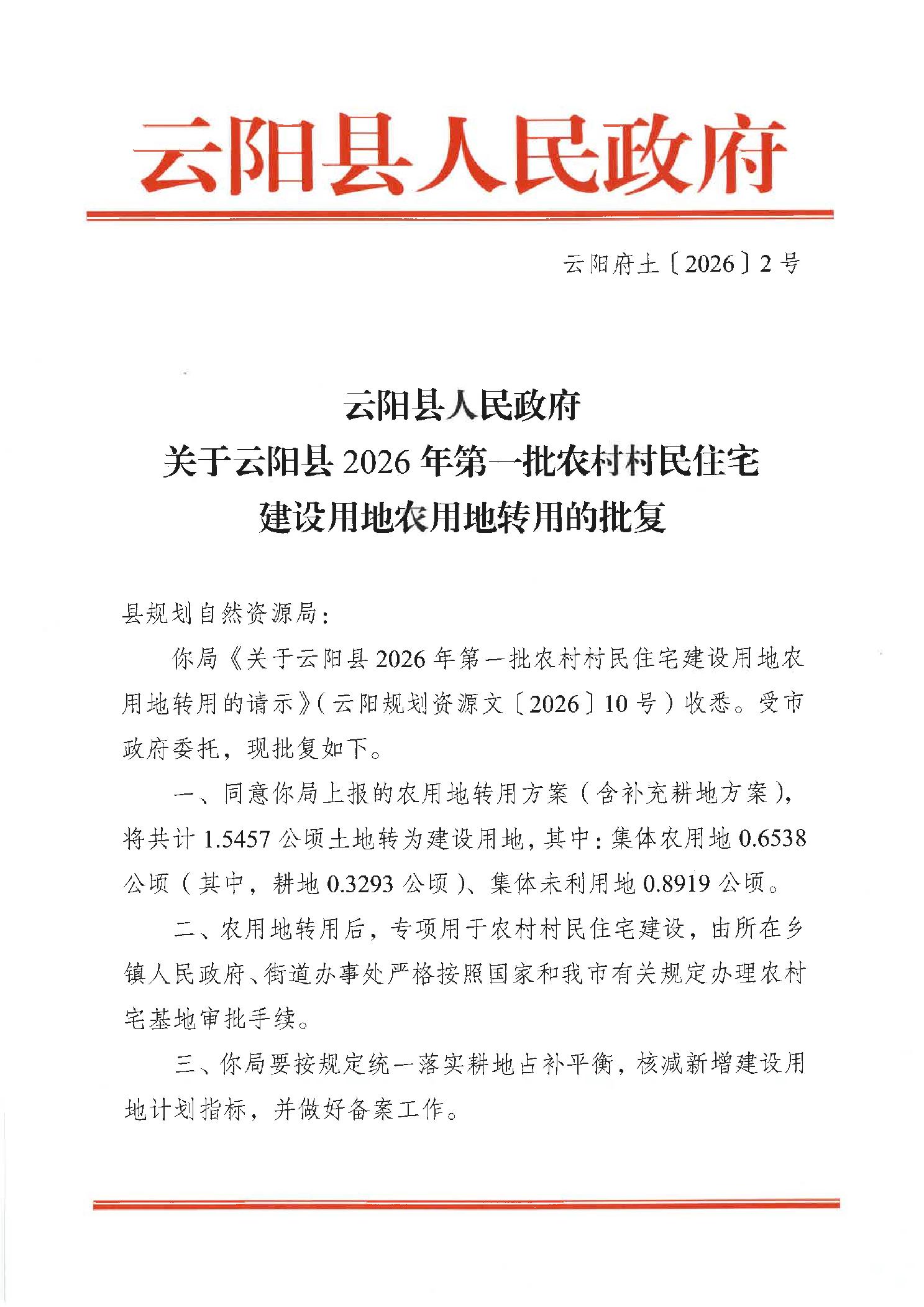 云阳府土〔2026〕2号关于云阳县2026年第一批农村村民住宅建设用地农用地转用的批复